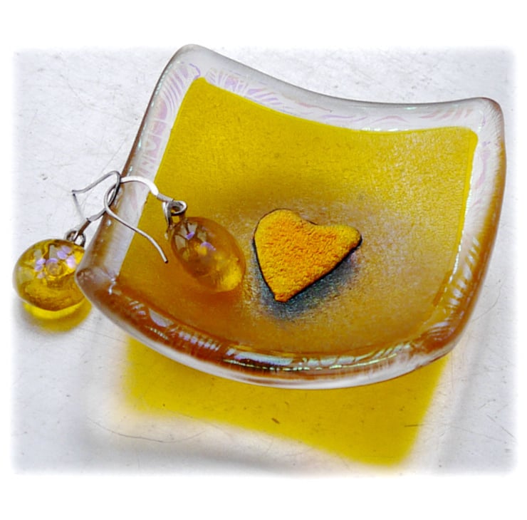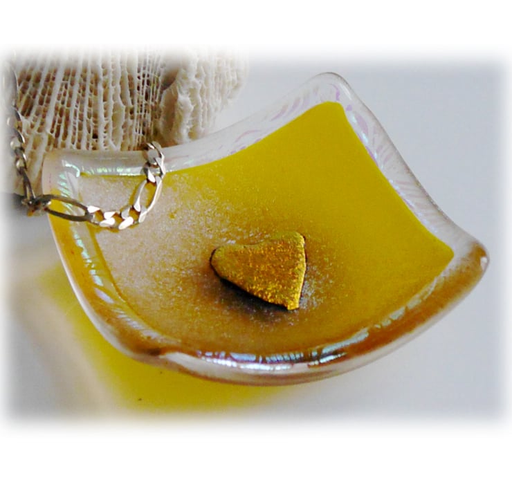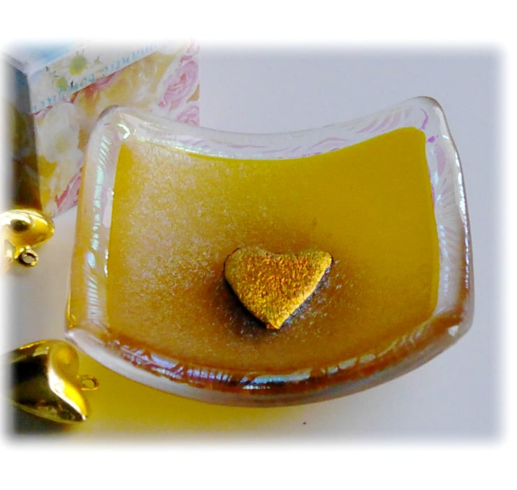 This little dish is cut from iridescent golden yellow glass with clear glass below and is bordered by a very pretty dichroic glass with aqua and purple tints. In the centre I've added a Dichroic bright golden heart which is fused into place to become one with the dish.