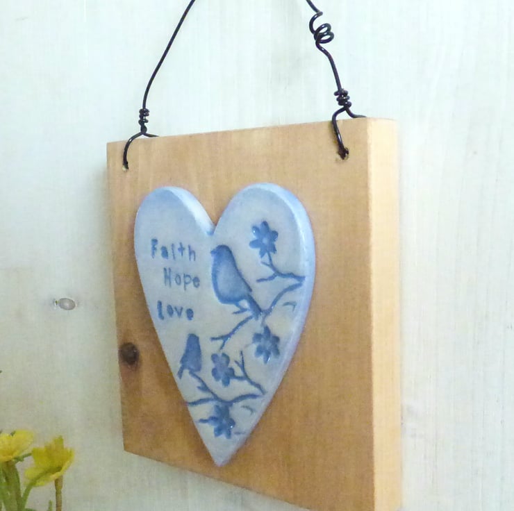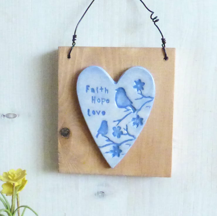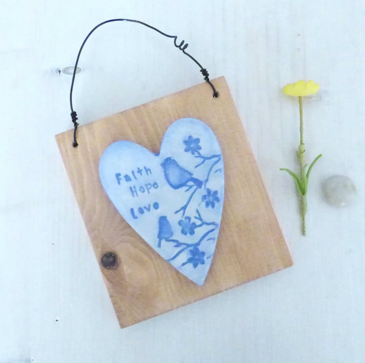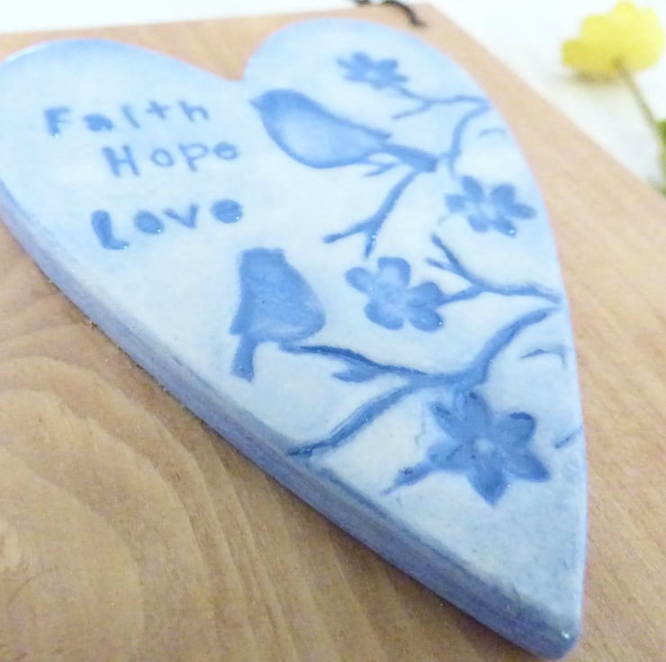 A lovely heart shape made from air drying clay. The words Faith Hope and Love have been impressed with birds, branches and flower design which gives the heart texture. Acrylic paints have been used to add colour and sealed with a glossy varnish to give a lovely shiny surface.