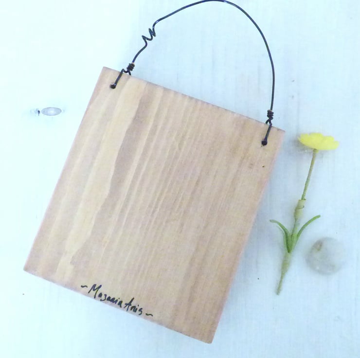 Approx size (of wood without wire hanging) H10cm x W9cm x D 1.5cm.