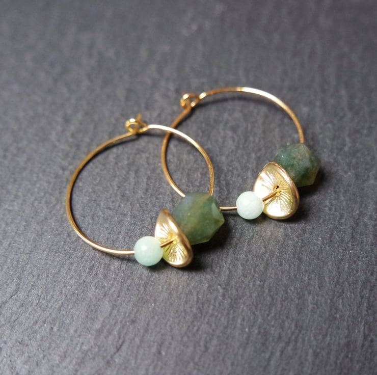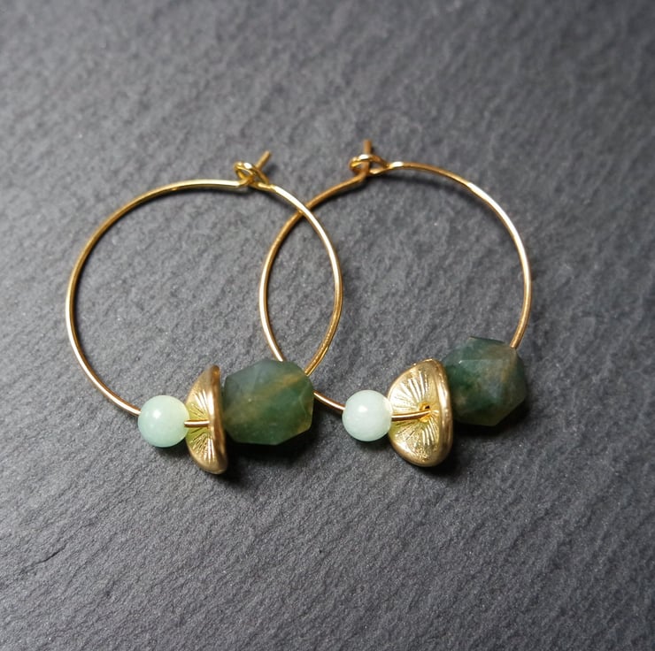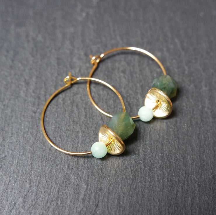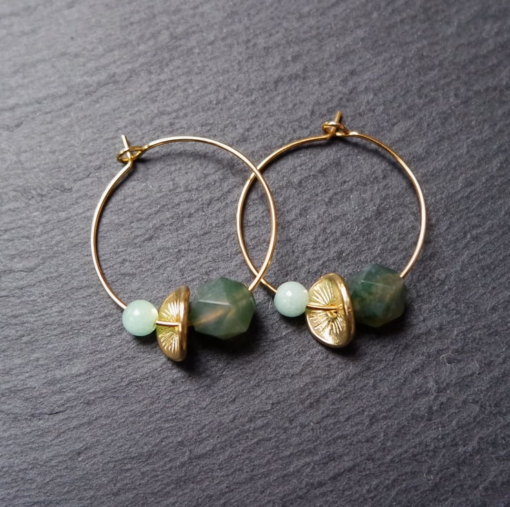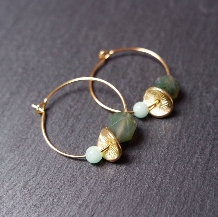 Beautifully floral looking gold plated hoops with a small turquoise quartz, a gold plated wavy bead and a faceted moss agate. The colour combination of gold/turquoise/green reminds me of spring and summer, nature, plants and water. Very pretty colours!