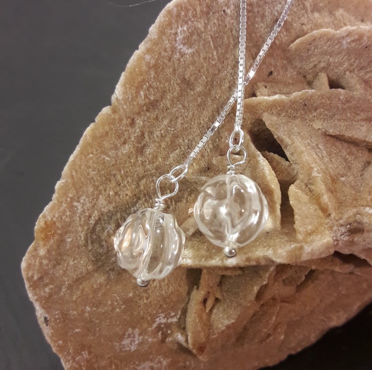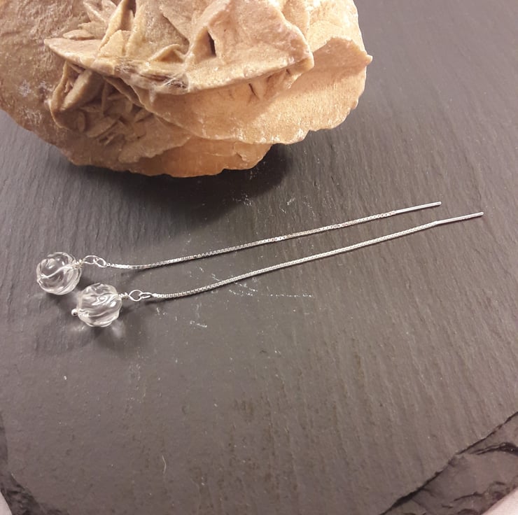 These are simple but elegant earrings. The total earrings, including post is 4in in length, giving you a huge variety of lengths to wear it at. The quartz has gorgeous clarify and is delicately carved into roses and 1cm in length. I've found these are popular with customer with dexterity problems, thanks to the lack of fiddly parts and you can put them in one-handed. The chain is a box chain, which moves very smoothly through the ear, I have longer chains in a different style if you want a different one. If you have a special request of colour/stone combination, do contact me for a quote.