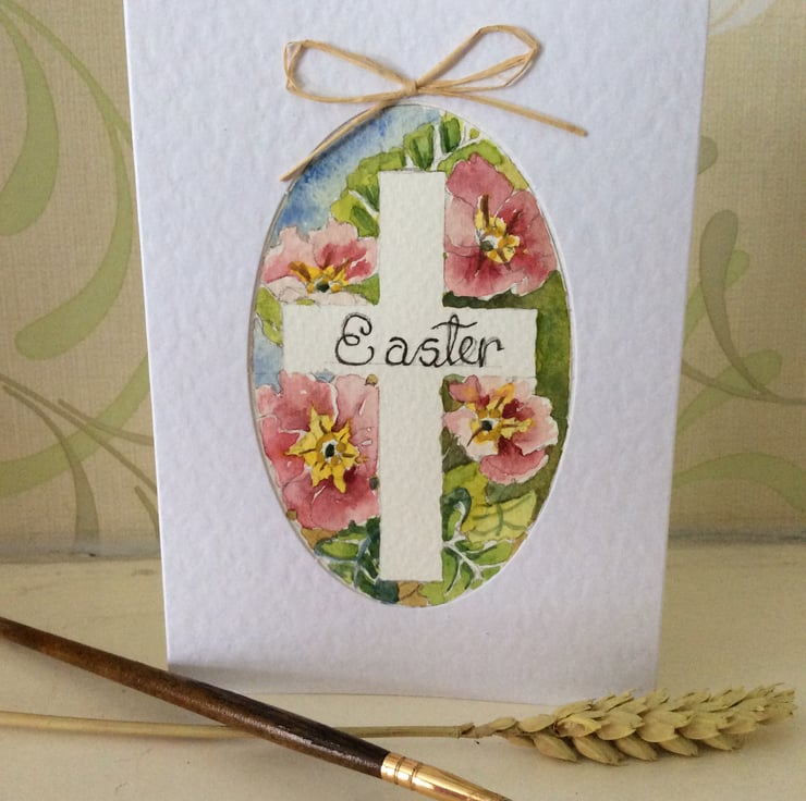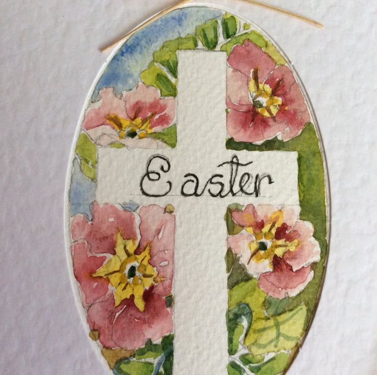 I specialise in creating handpainted greeting cards and watercolour paintings which are all original artwork and not prints. This card has been created especially for Easter and depicts a cross surrounded by pink primroses. The painting has been done on watercolour paper using watercolour paints and has been mounted in a window framed card. The word 'Easter' has been written inside the cross but the card remains blank for your own personal message. The card comes with an envelope. I have made three cards following the same theme but with different spring flowers behind the cross so could be bought as a pack of three.