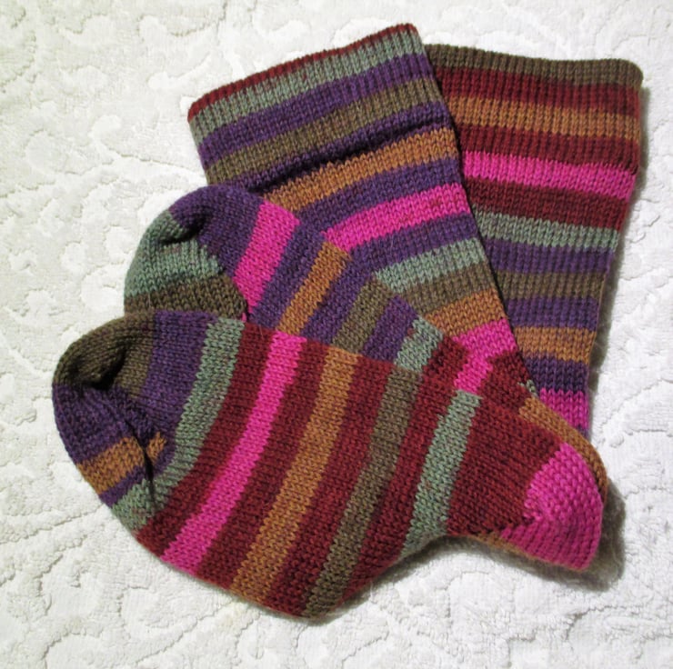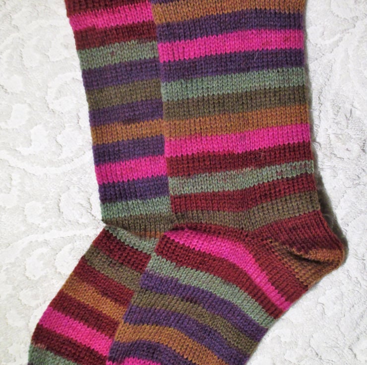 I started making socks as i found it hard to find good quality socks with no seams in the toe. The first pair was fro a vintage pattern from my Granny and when everyone in the family saw them, they all wanted a pair and my market got bigger and bigger. Now when I pop to the shop in the village, I look down at everyone's feet and invariable I will see a pair of socks that I have made. A quality sock from fun yarn !