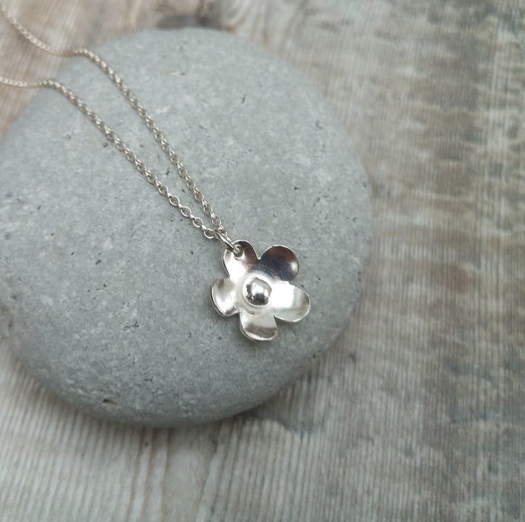 This dainty flower necklace has been hand cut from Sterling Silver sheet, filed, polished, given a gentle hammered finish and a little handmade Sterling Silver pebble has been soldered to the centre.