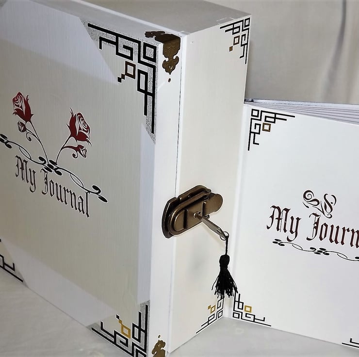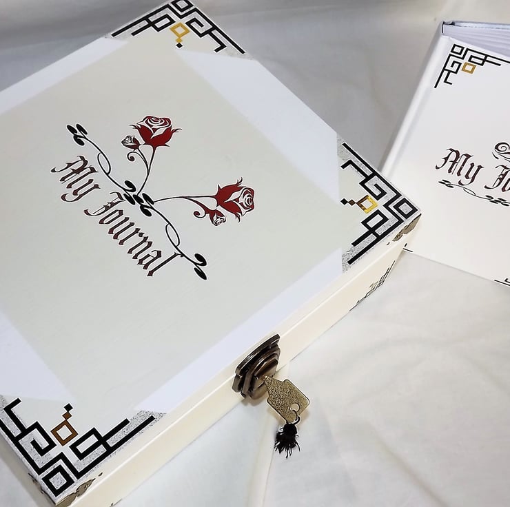 This is a large wooden lockable journal Set is White, Cream and Gold, with a the rose graphic in red and gold and black borders.The font is gold with a mixture of red and black and the borders are black vinyl and glossy gold.