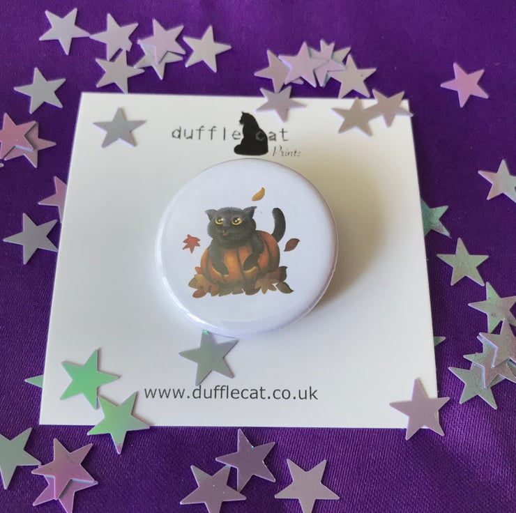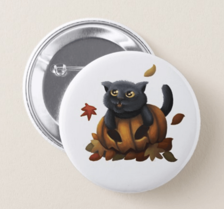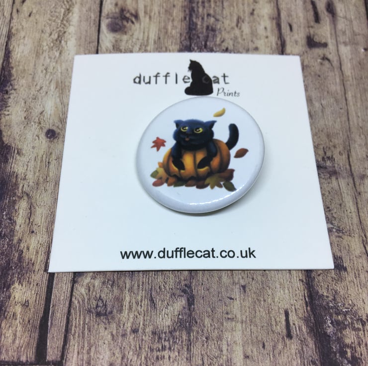A quirky pumpkin cat badge. Standard, 3cm (1.25") Round Badge, Covered with scratch and UV-resistant Mylar. Metal and plastic. With a steel pin back.