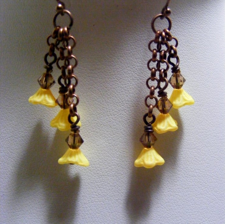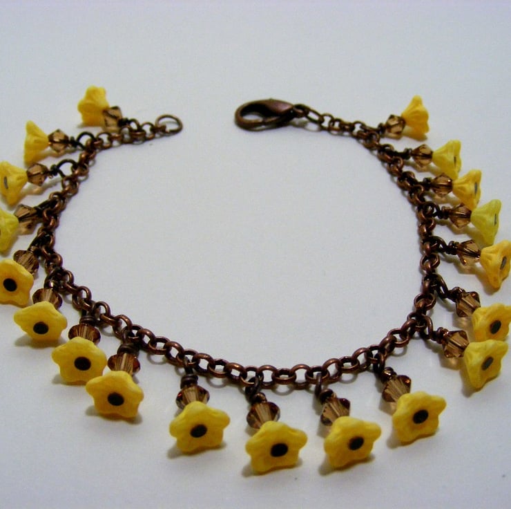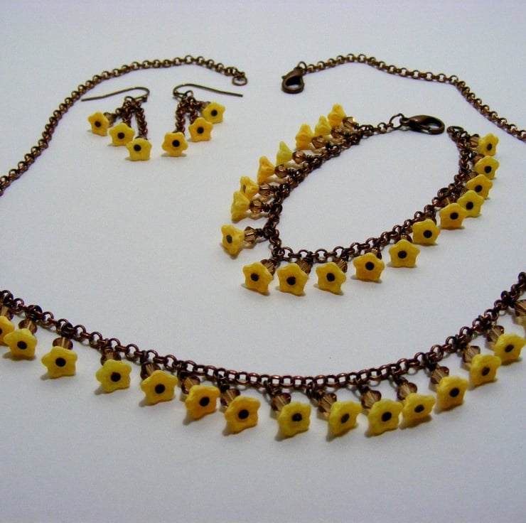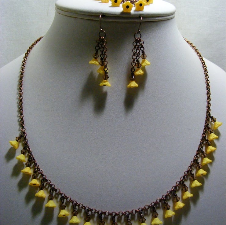 I have made this one of a kind jewellery set which consists of a necklace, bracelet and earrings using, 7 x 5 mm matte spring yellow glass flowers which are threaded on antique bronze headpins with 4 mm smoked topaz Swarovski bicones and wrapped onto antique bronze round link chain for all three pieces. Necklace and bracelet have lobster claw clasps attached and earrings have ear wires attached.