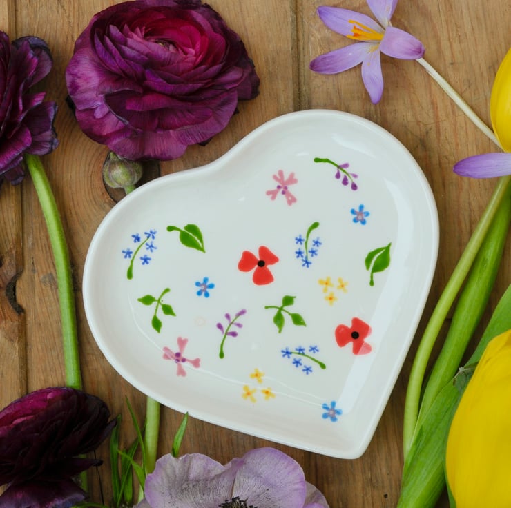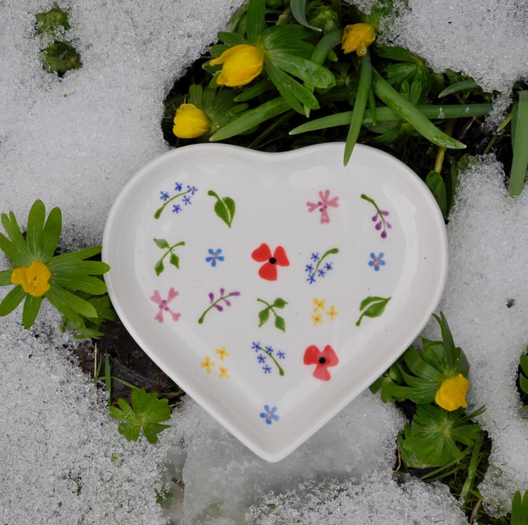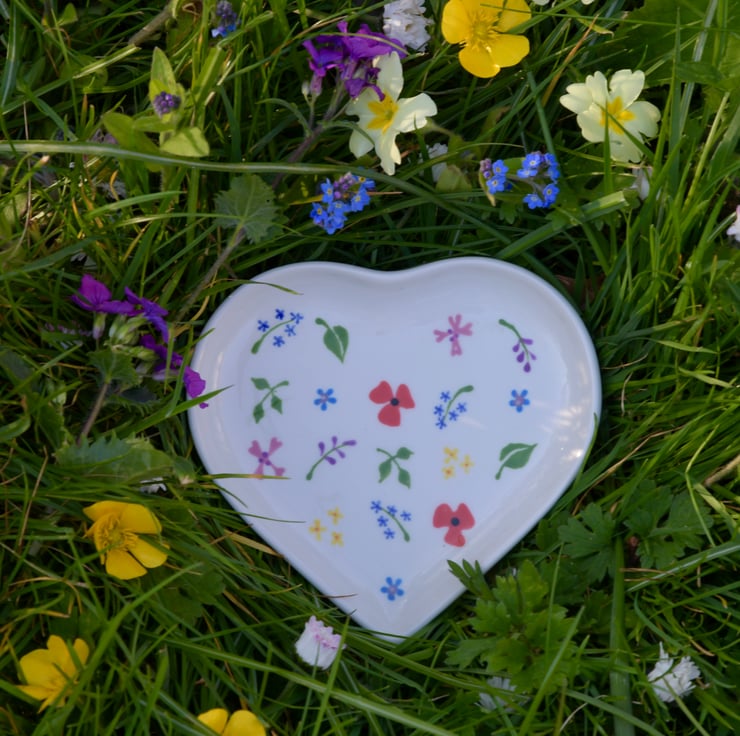 Little Wild Flower buds hand painted on this heart dish has a multitude of possible uses- for jewellery on the dressing-table, for biscuits at a tea party.