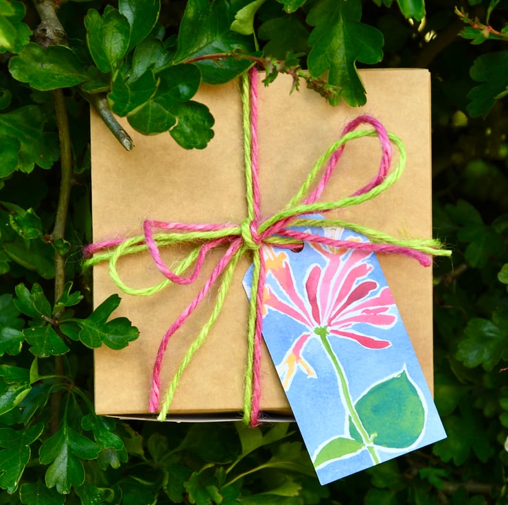 This will be beautifully packaged in a special brown cardboard box and tied up with coloured string. One of my personally designed gift tags will be attached, on which you can write your own message, or I can add a message for you.