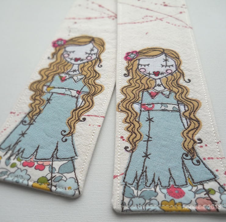 these fabric bookmarks are quite substantial, measuring approximately 25 cm x 6 cm (10” x 2.5”), and are machine washable.