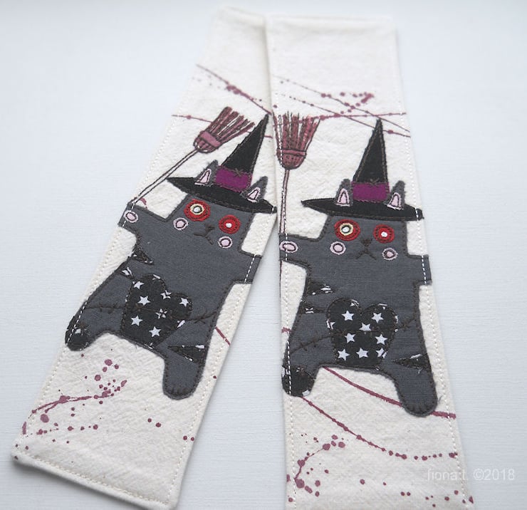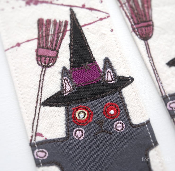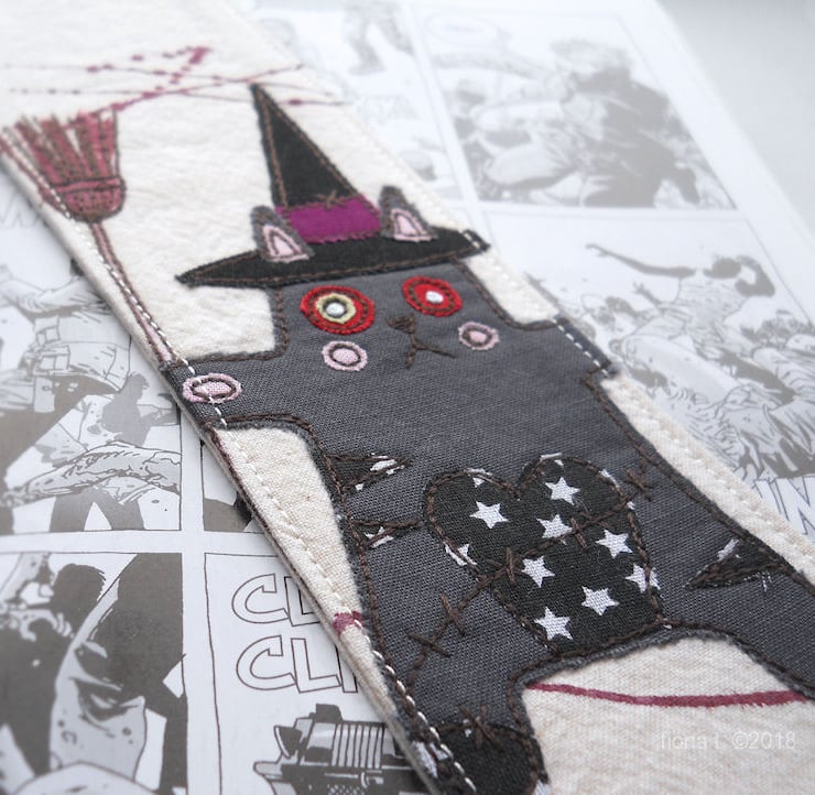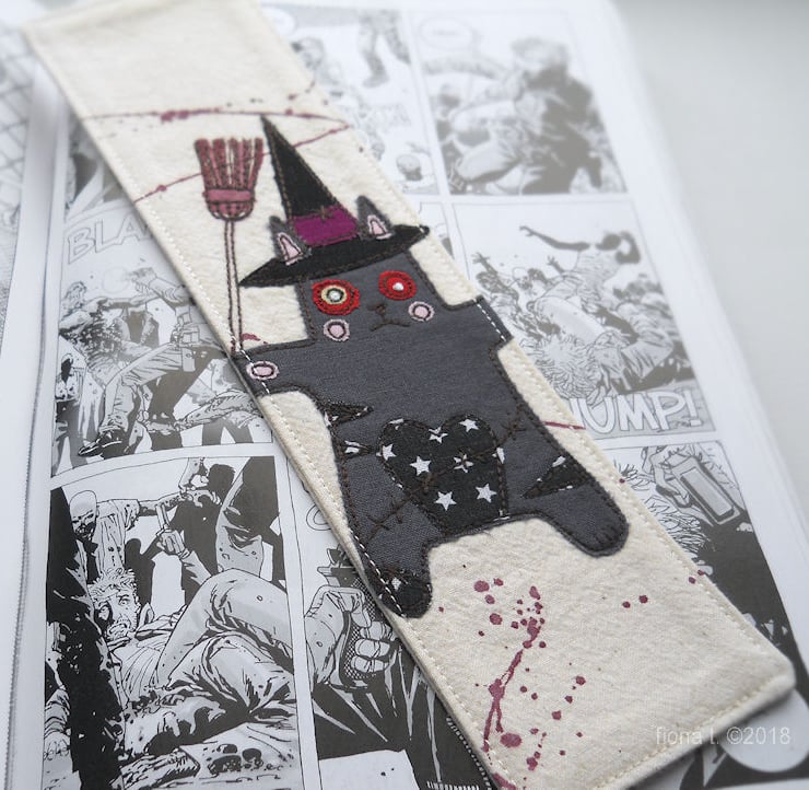 applique & freemotion embroidery fabric bookmark - zombie kitty witch.