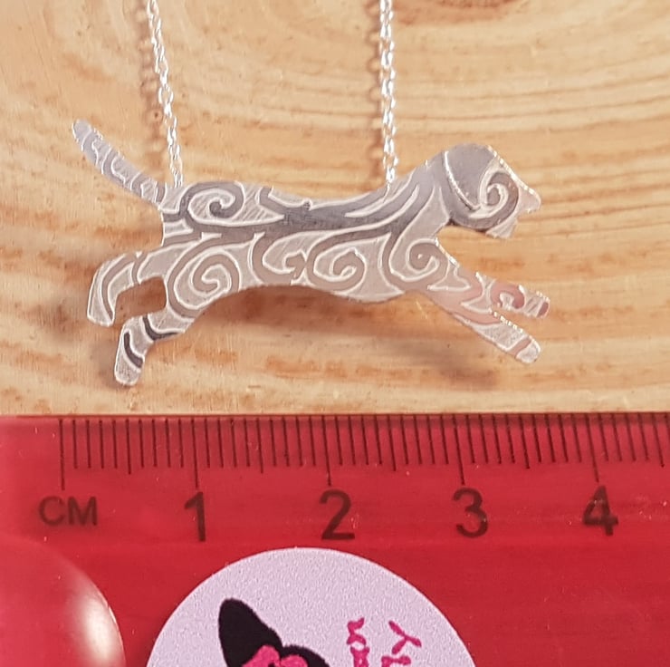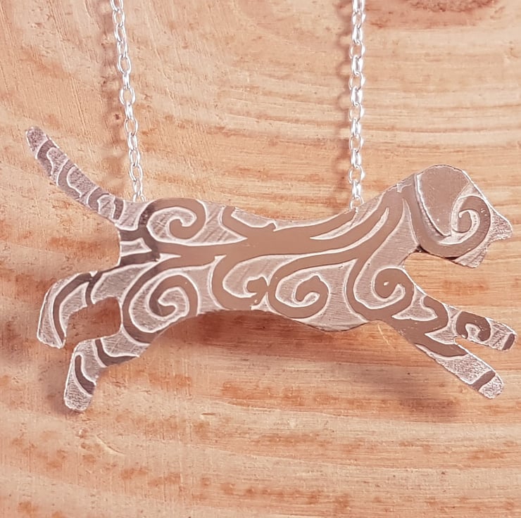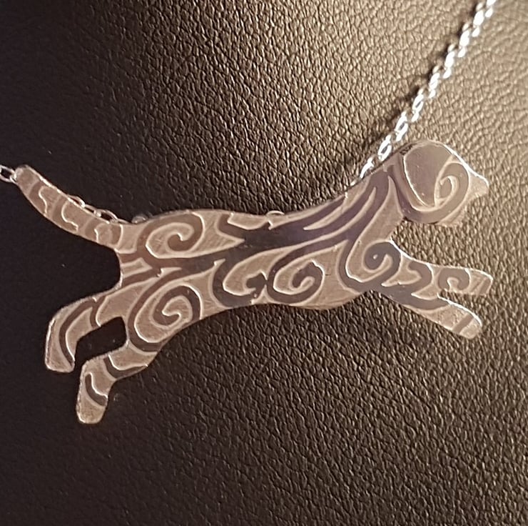 A decorative and unusual silver dog necklace, ideal for dog lovers. The shape of a running dog has been hand cut from a sheet of silver, and drawn with a swirl design. It has then been etched, and the ear of the dog soldered on. Two loops have ten been soldered to the back for the chain.