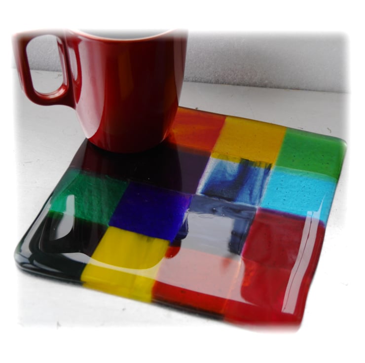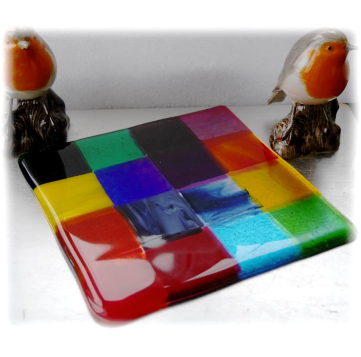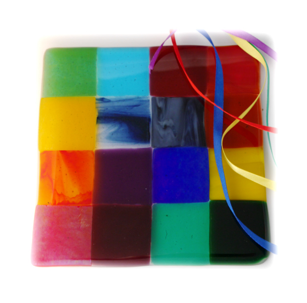 The trivet has a base of clear glass which is then topped with 16 x 4cm squares of rainbow colours of glass, twice round the rainbow, all different..