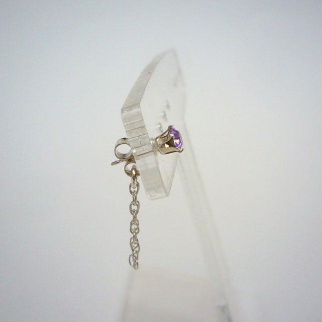 These are simple earrings with violet crystal and a chain drop. The Swarovski® crystals are 4mm, the chain drop is approximately 2cm and is attached to the scroll.