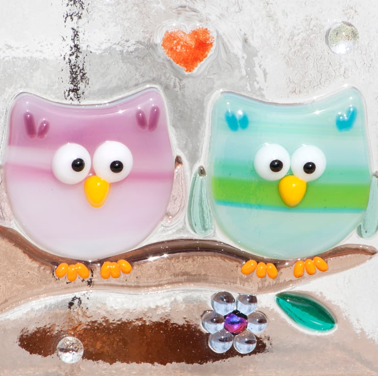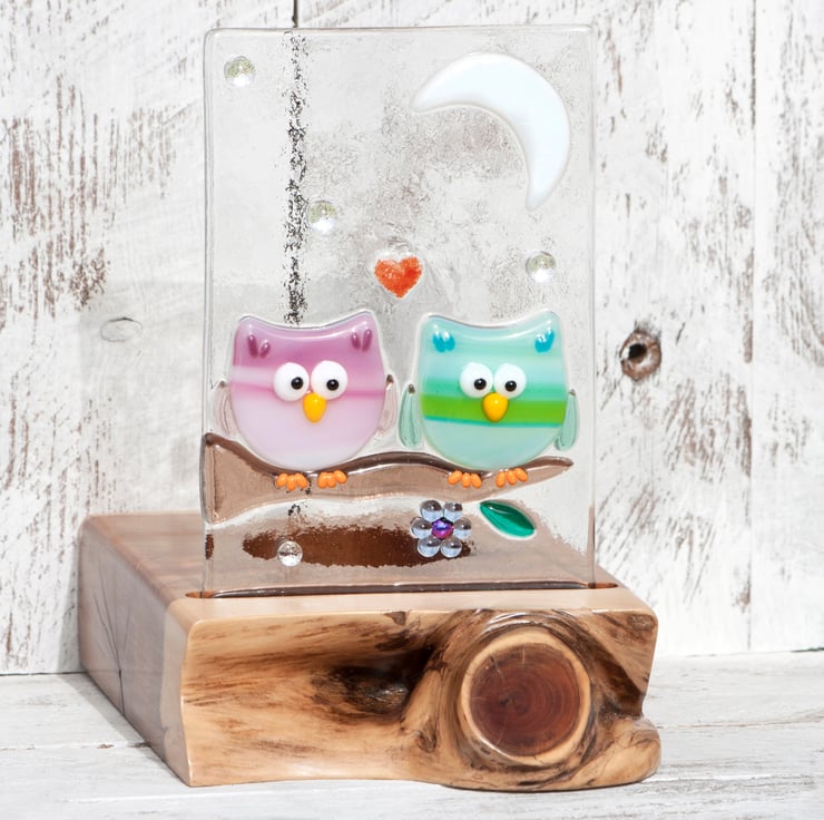 This lovely little scene features to owls in love. They sit on a branch under the moon and stars. The moon is made from shimmery iridescent glass and the stars are silver dichroic.
