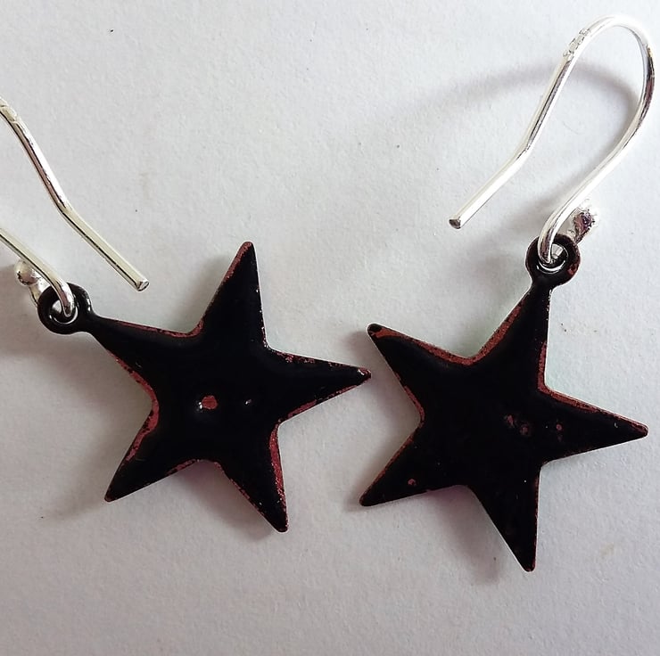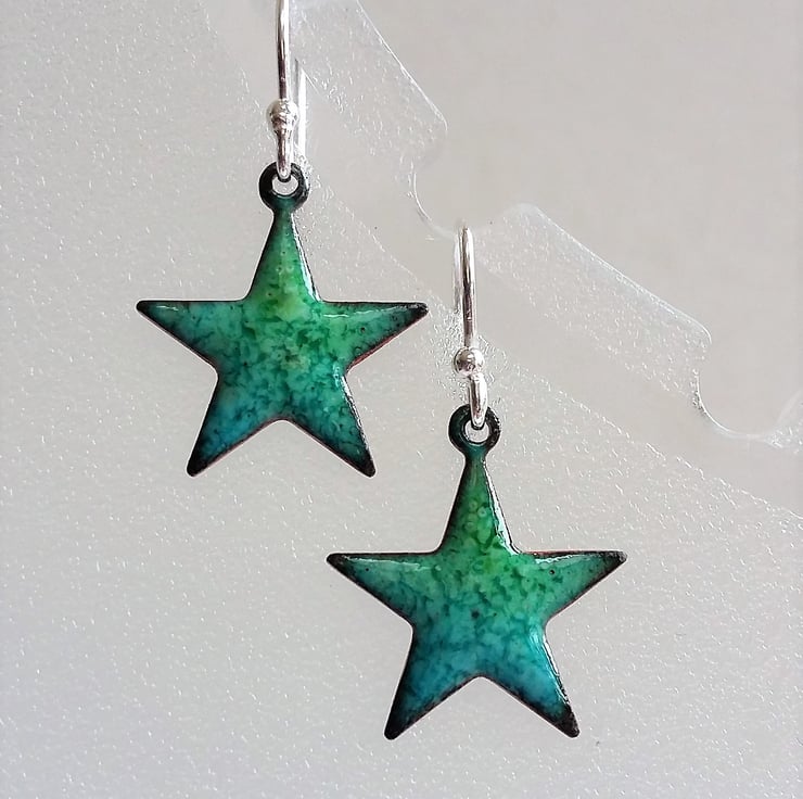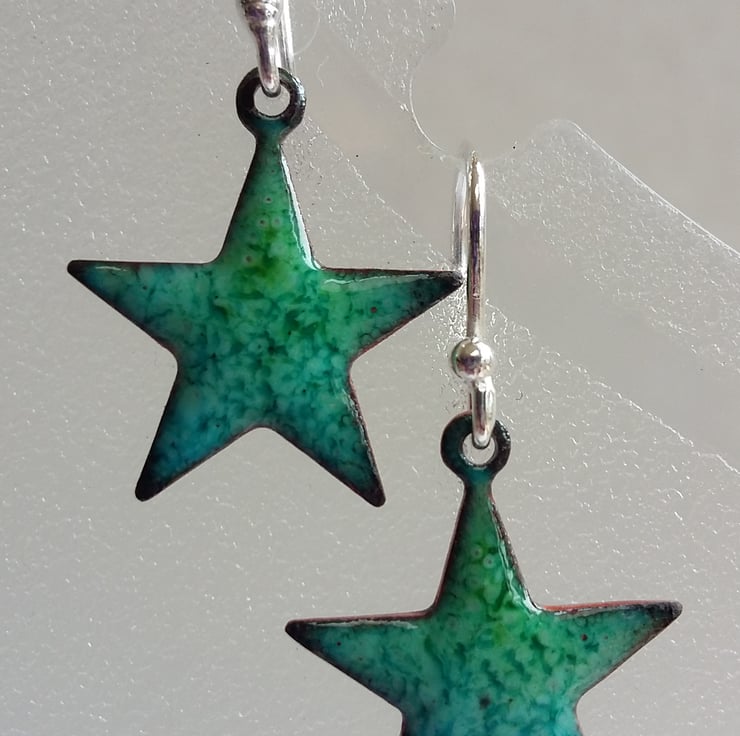 A pair of five-pointed star earrings in shades of blues. The earrings have been kiln-fired and each measures approximately 17mm by 20mm, and come complete with sterling silver earring wires. The backs have been finished in glossy black enamel. They are supplied with a little organza pouch and POSTAGE IS FREE!