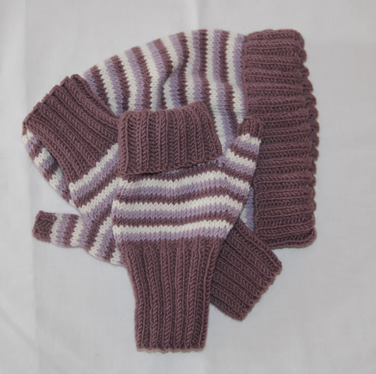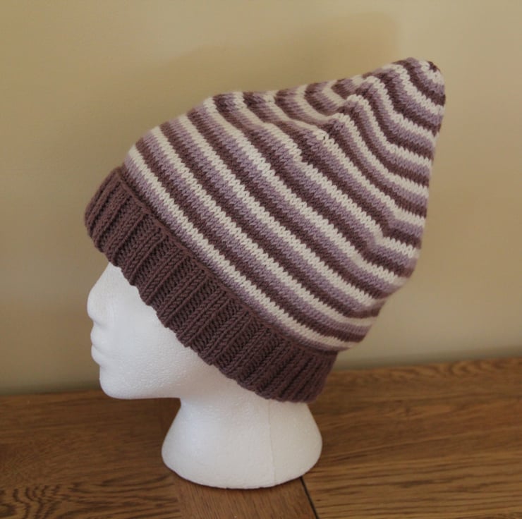 A gorgeous soft hand knitted plum and cream shades beanie knitted in 50% Baby Alpaca and 50% Merino Wool. A really special hat that would make a lovely gift!