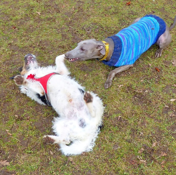 If your whippet isn't used to wearing jumpers, it is best to 'feed' the legs & nose through first while the dog is lying down, so that the legs don't get trapped inside bent!! Hettie is well used to the jumper 'feed' now!