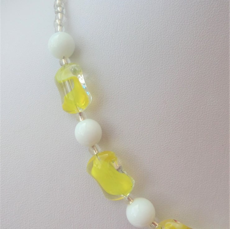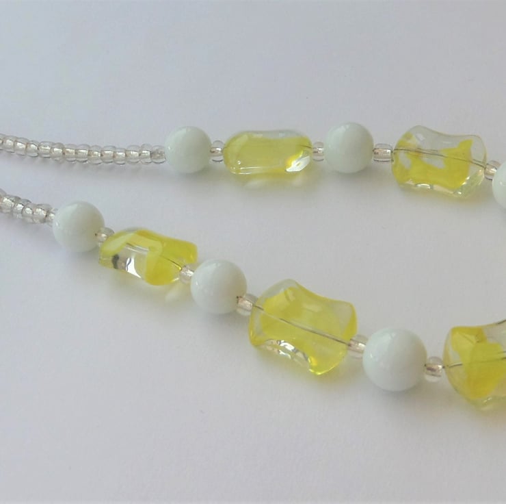 Necklace made using 15mm x 12mm yellow and white beads, 10mm white opaque beads and clear silver lined seed beads. Measures approximately 17.5 inches and fastens with a silver coloured lobster clasp.