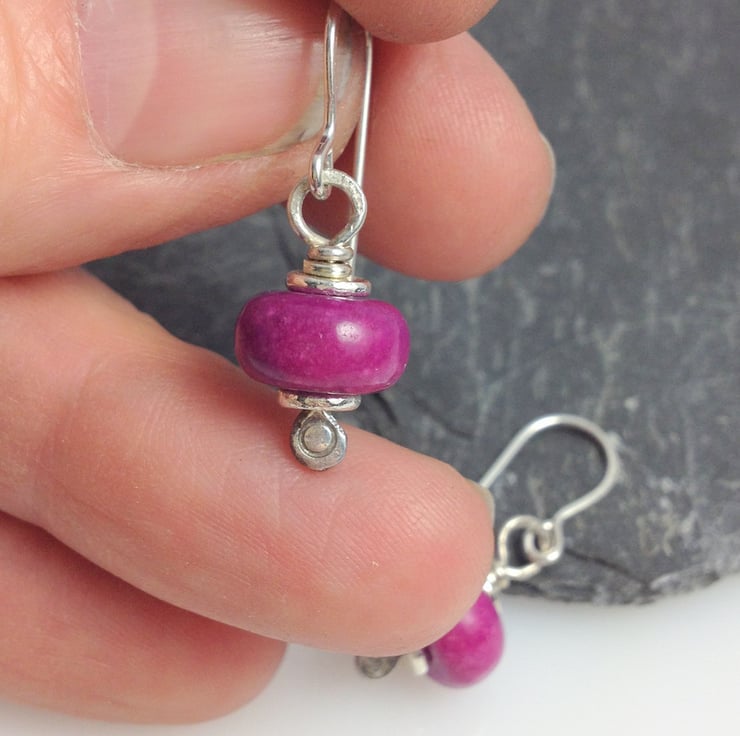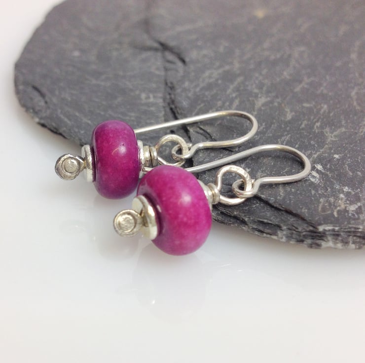 8mm lushious plump fuchsia jasper beads are combined with my hand forged silver head pins and washers.