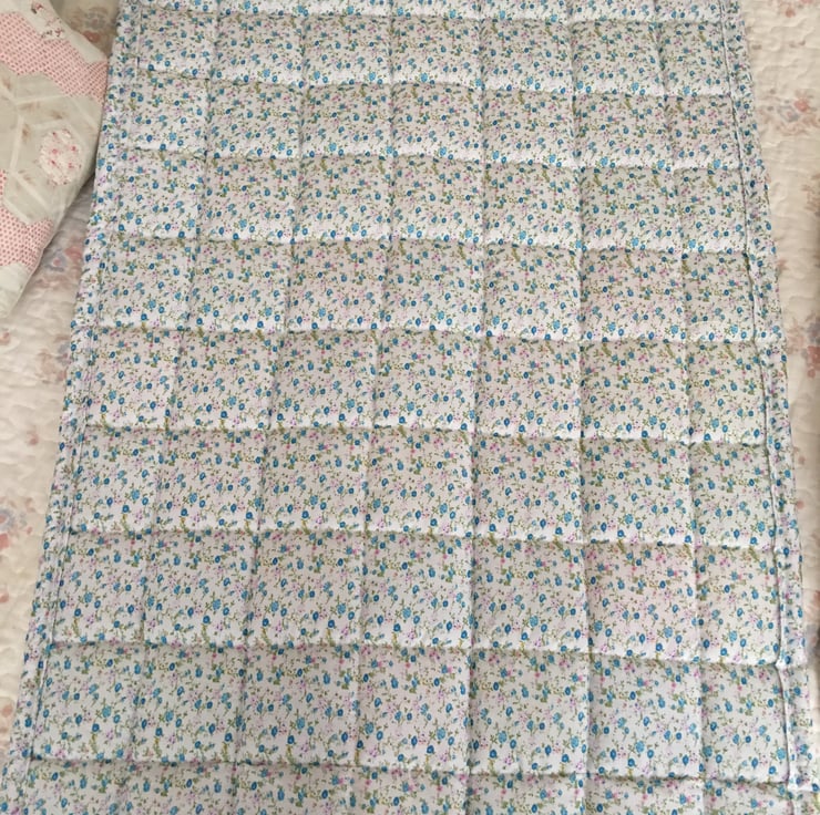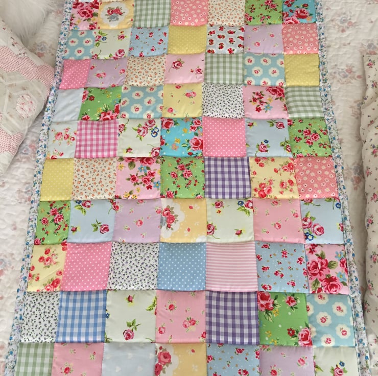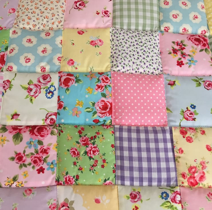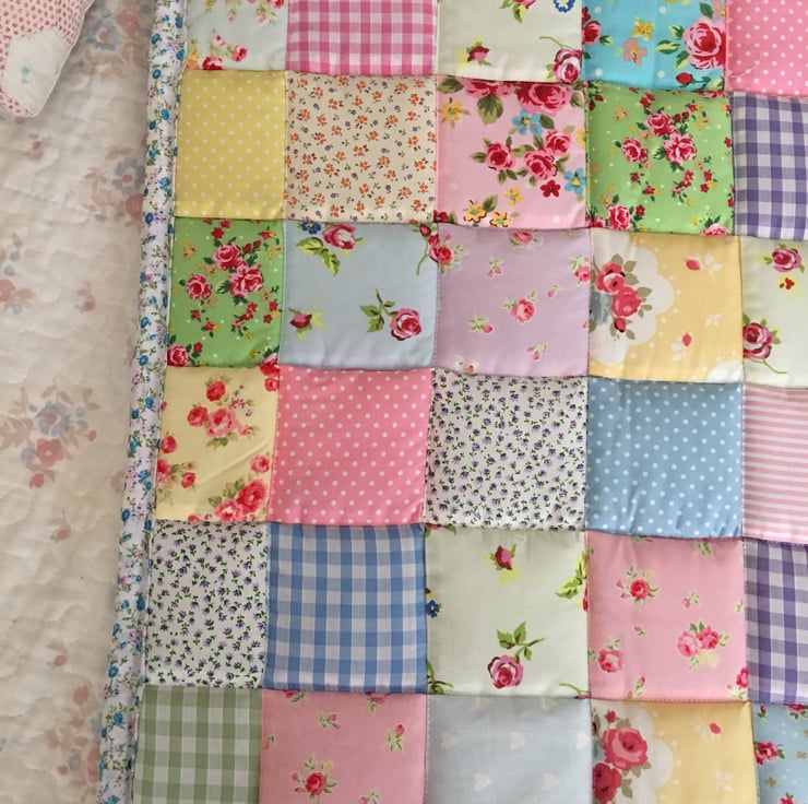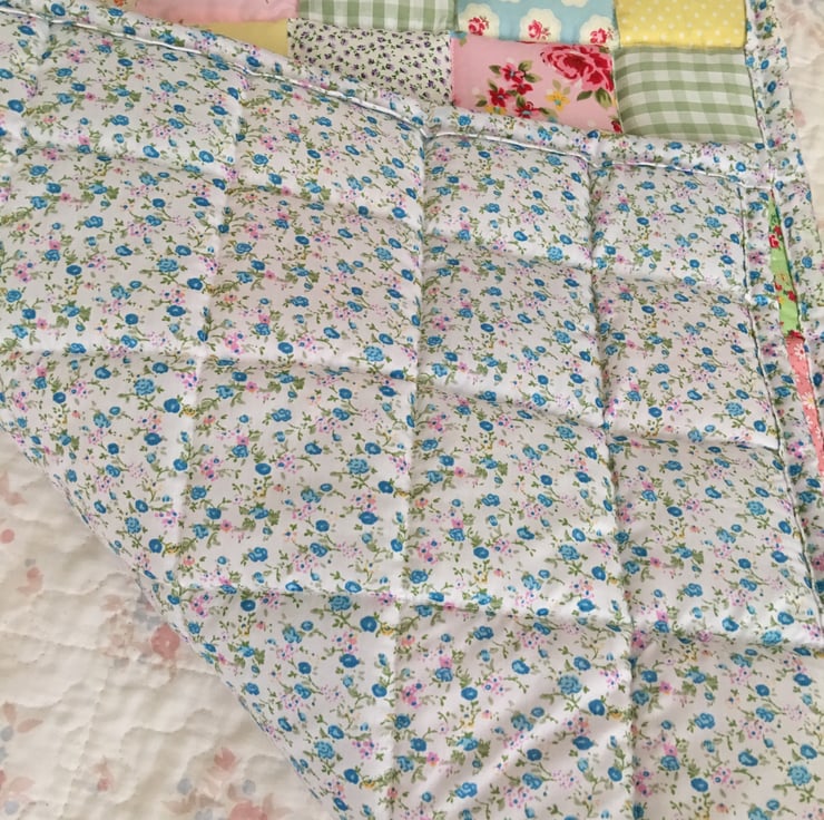 Gorgeous patchwork cot quilt made with gorgeous fabrics with a floral cotton fabric trim and back it has been quilted and It measures 93 cm x 60 cm