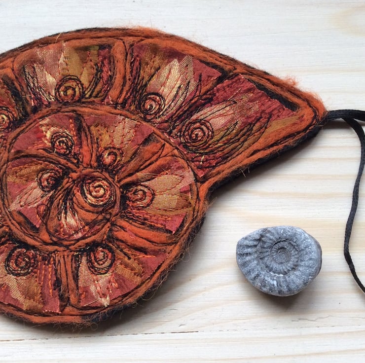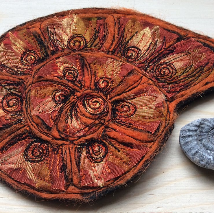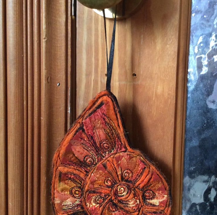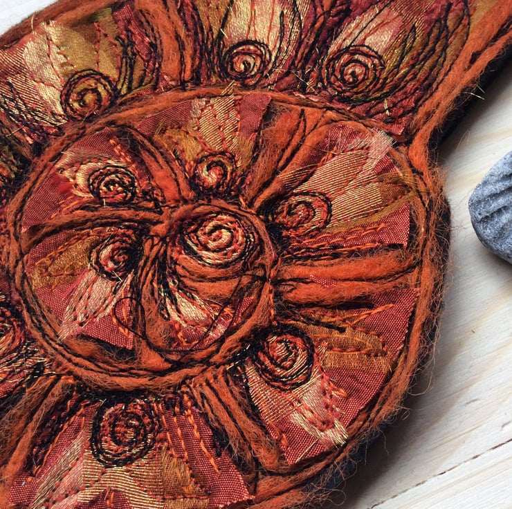 I love the ammonite shape, it crops up again and again in my work. This one is done using a new material for me, felting. After meeting for coffee with a friend we went shopping and came home with felting needles and wool and here’s the result! I’ve used black felt, orange felting wool, brick red silk and lots of gloriously rich gold organzas all stitched down with black thread and a black ribbon to hang it by.
