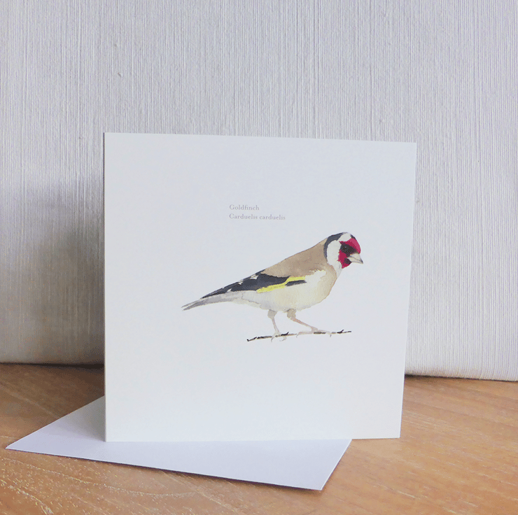 The colourful goldfinch is featured on this square (148 mm x 148 mm) greeting card. The bird was originally painted in watercolour on beautifully textured Saunders Waterford paper.