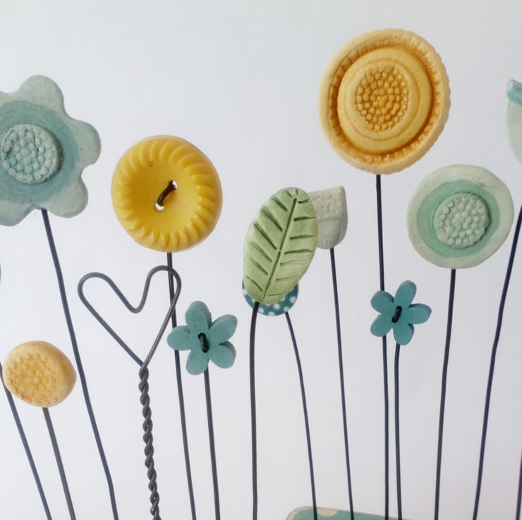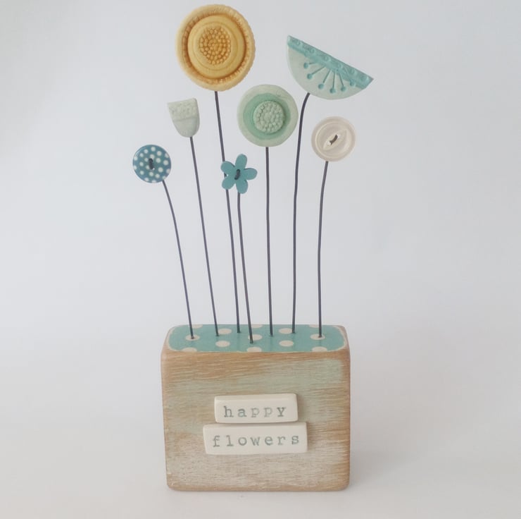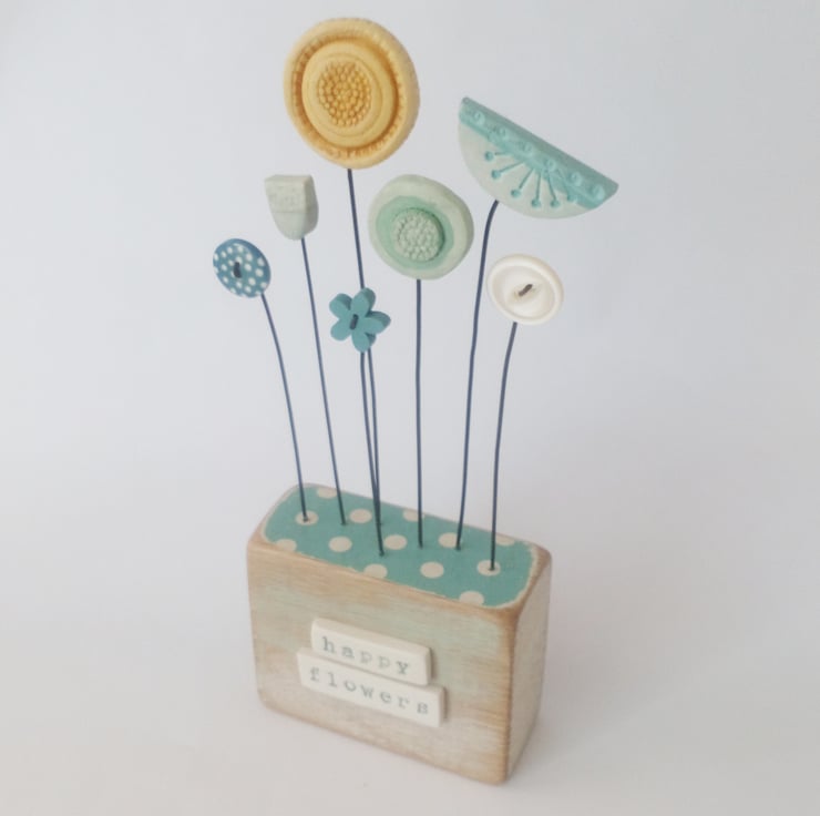 There are three little button flowers with a four flowers handmade from polymer clay. They are moulded and patterned, fired and hand painted to finish.