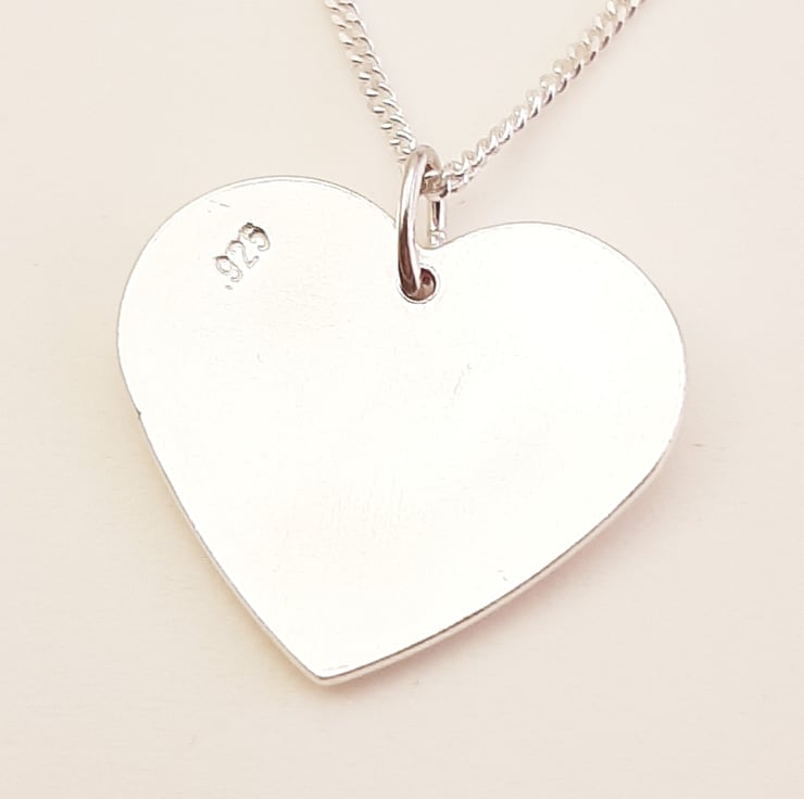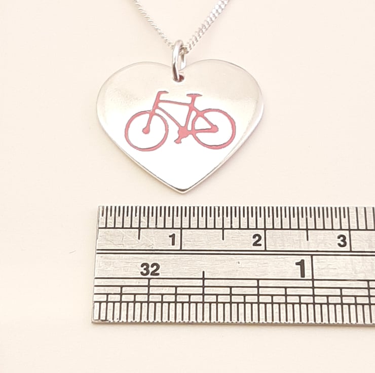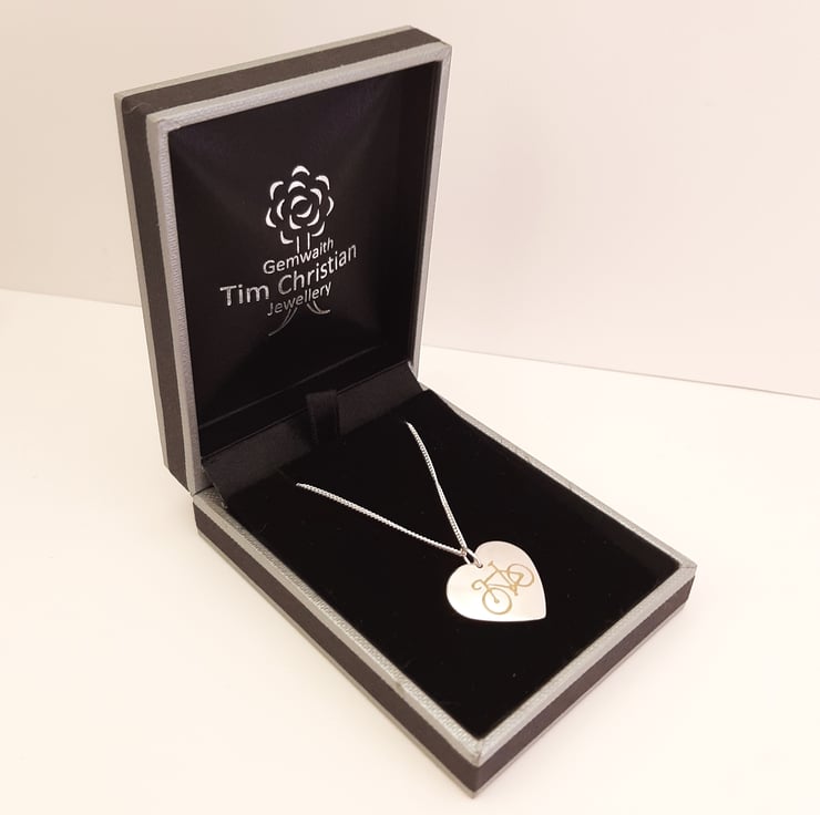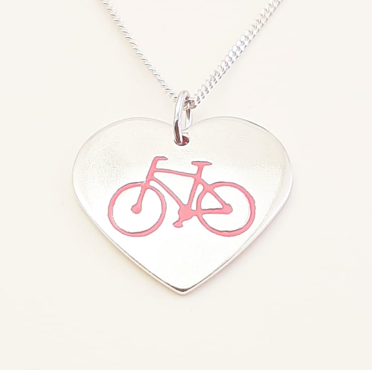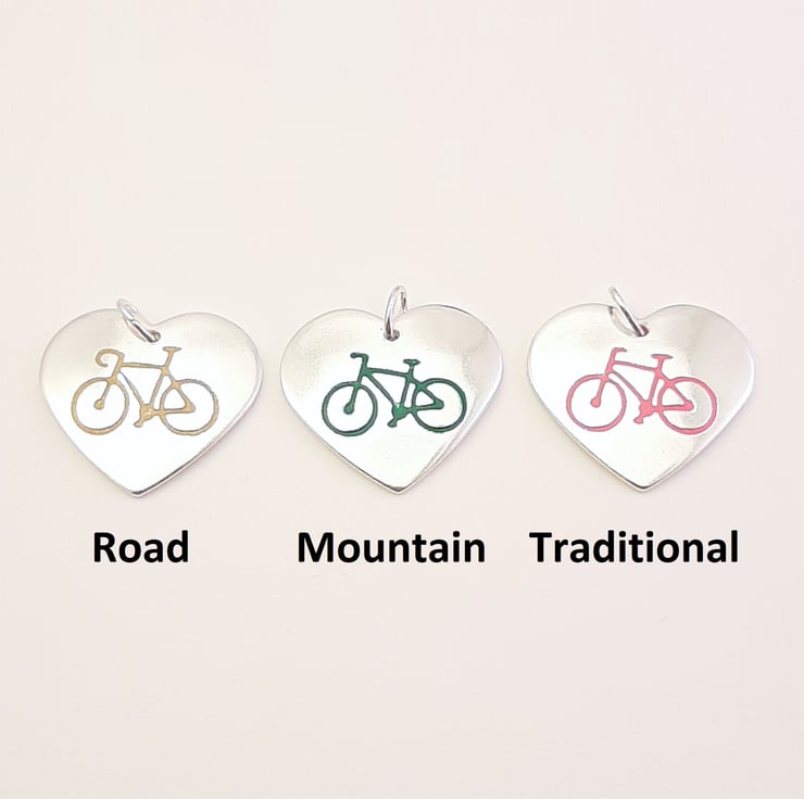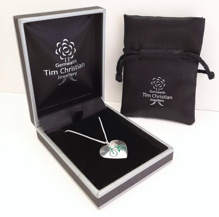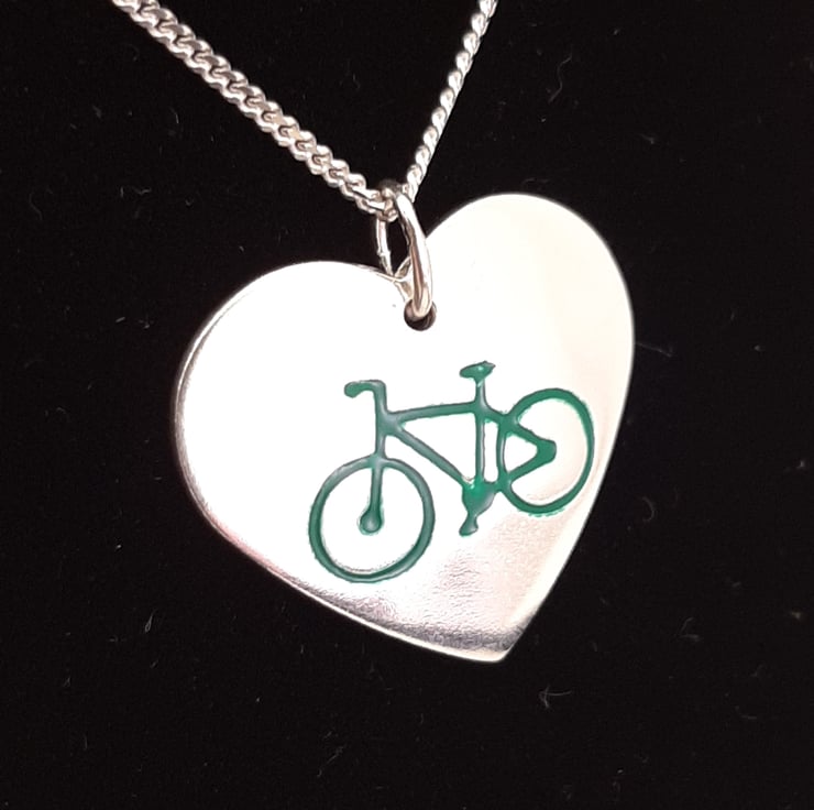 This cycling themed pendant has been lovingly handcrafted in North Wales. The heart is punched from sterling silver sheet and an image of a bicycle is then etched onto it. The edges are smoothed using files and emery paper and then I drill a hole and attach a jump ring. It is then given it's shape using a hammer and punch. A coloured resin based enamel is added to the etched bike before being polished. The pendant is then attached to a chain.