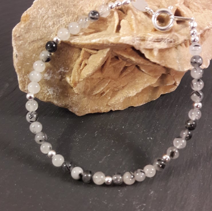 This cute little bracelet is made of 4mm black rutile quartz, white quartz laced with black tourmaline inside it and 3mm sterling silver beads, finished with sterling silver findings. I will then attach your choice of sterling silver charm, see the photo and list below, next to the clasp. The bracelet is 8 inches in length, with fantastic sparkle from the faceting. If there is a particular colour you'd like, let me know, I have a wide range of petite gems, they also look great stacked together.