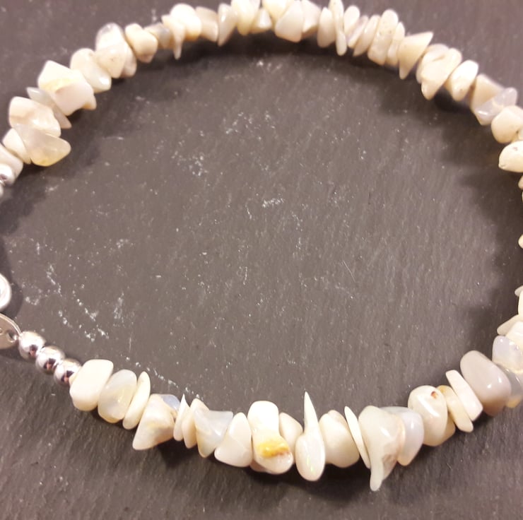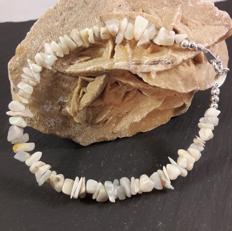 This bracelet is made from chips of Ethopian Opal and sterling silver beads. The overall length is 8in/20cm and is finished with a sterling silver bolt ring clasp.