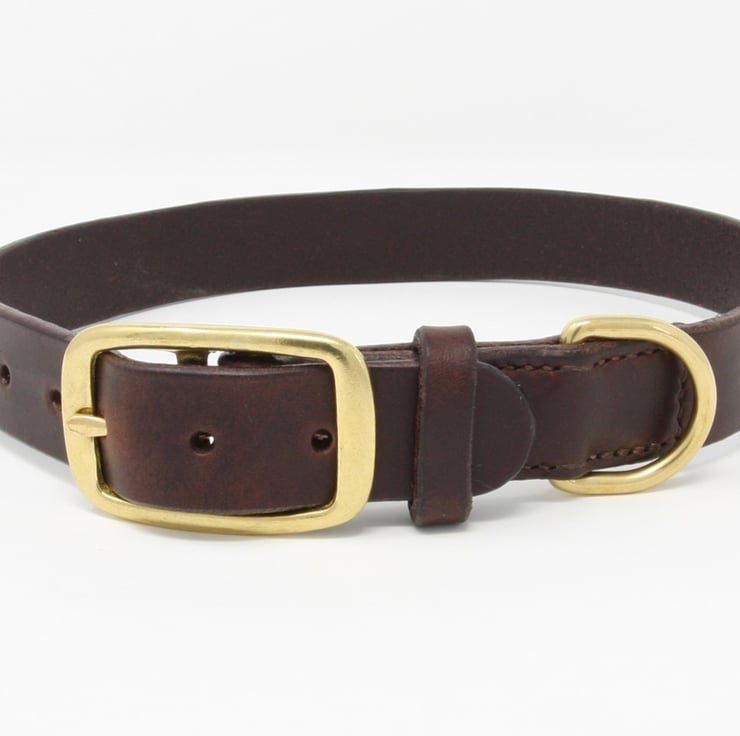 The collar comes with a brass buckle and D ring, and is 1" wide. Collars are made to order so you can choose the correct length. When ordering please let me know the circumference of your dog's neck. This can be measured using a soft tape measure, or by measuring your dog's existing collar. Measure from the most used hole, to the end of the leather where it goes round the buckle (or to the bar across the buckle where the pointy bit sticks up from if you have a double-bar buckle like the one shown in the photo).