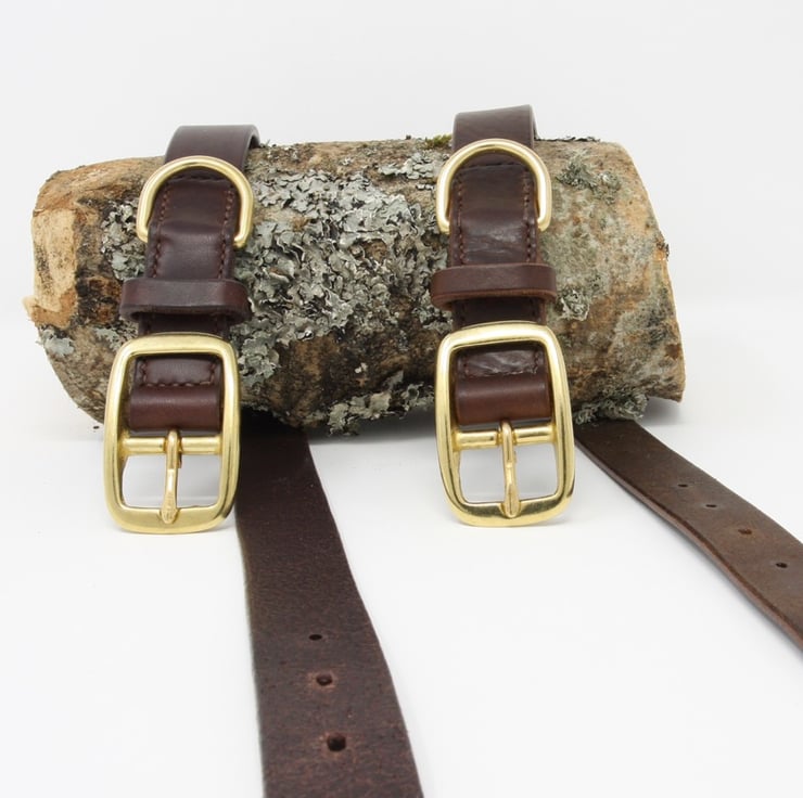 When I told friends I was making small leather goods I was asked if I made dog collars. I didn't, so I thought I'd better so something about it! My dog-owning next-door neighbour advised on the details, such as making sure there were no rough edges to catch on hair and irritate the dog, and using stitching rather than rivets to ensure strength and a long life for the collar. I sourced some buckles, and started first with nickel-plated buckles, but I kept getting asked for brass! So here we are with brass dog collars :)