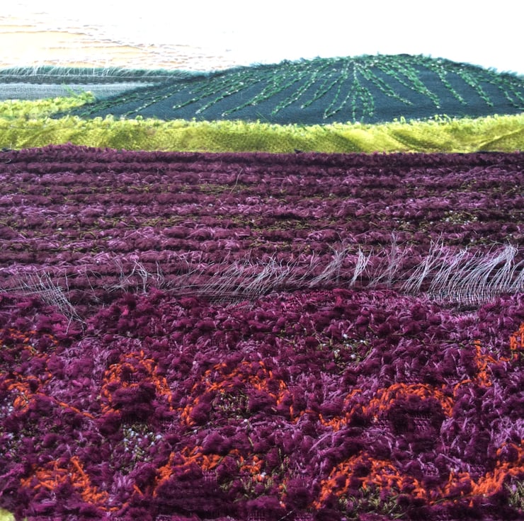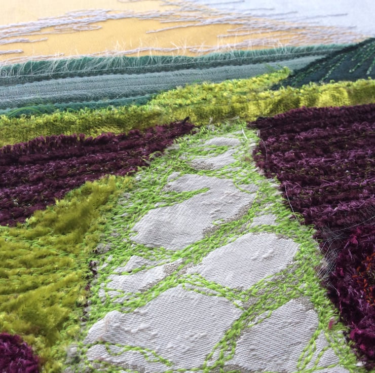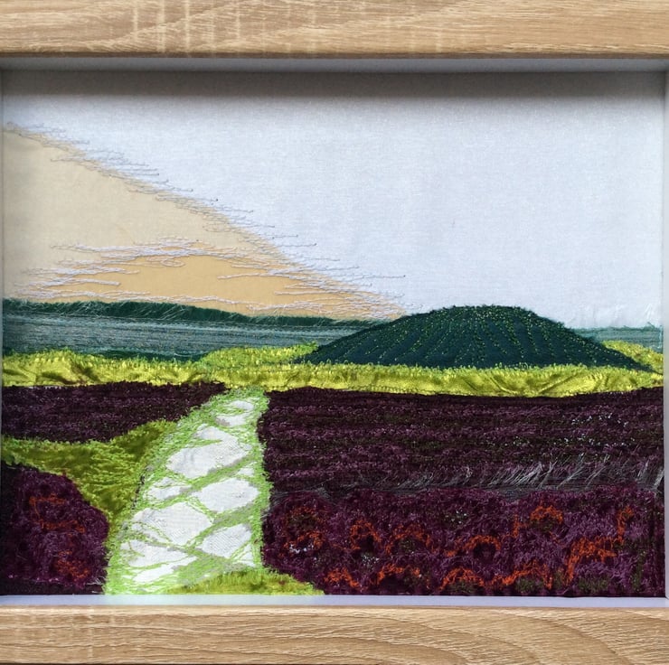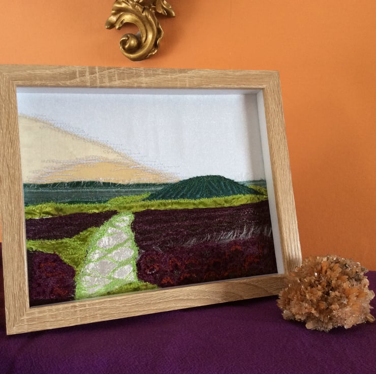 This embroidered landscape shows the North Yorkshire Moors when the heather is out, the mist was just leaving and the sun was rising. It’s a textile collage made with up-cycled fabrics and sewn down by free motion embroidery.