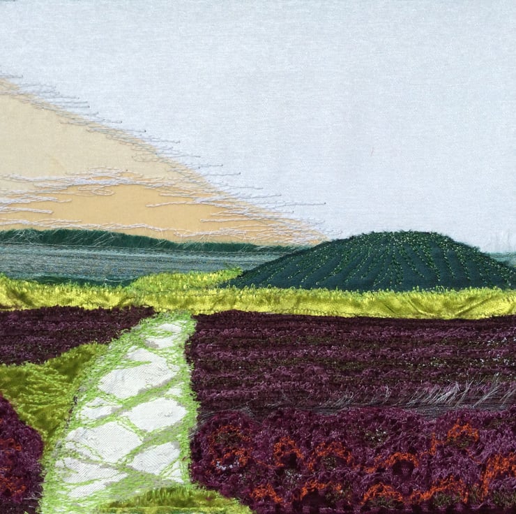 This embroidered landscape shows the North Yorkshire Moors when the heather is out, the mist was just leaving and the sun was rising. It’s a textile collage made with up-cycled fabrics and sewn down by free motion embroidery.