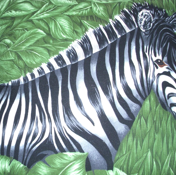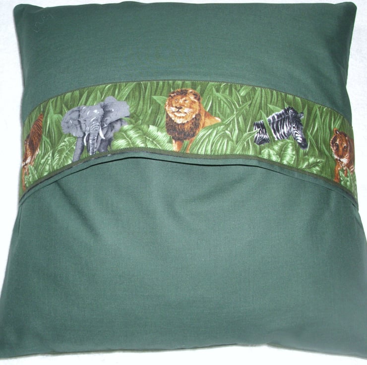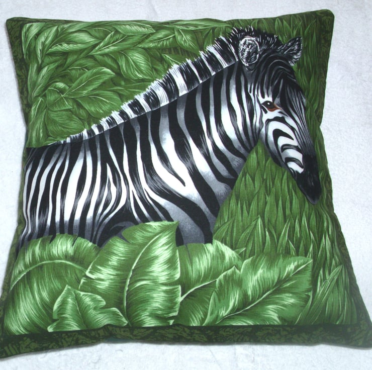 On Safari Zebra in greenery cushion with a zebra in the middle of green leaves and grasses, on the envelope back of the cushion is a complimentary strip with tigers, an elephant, zebra and lion.
