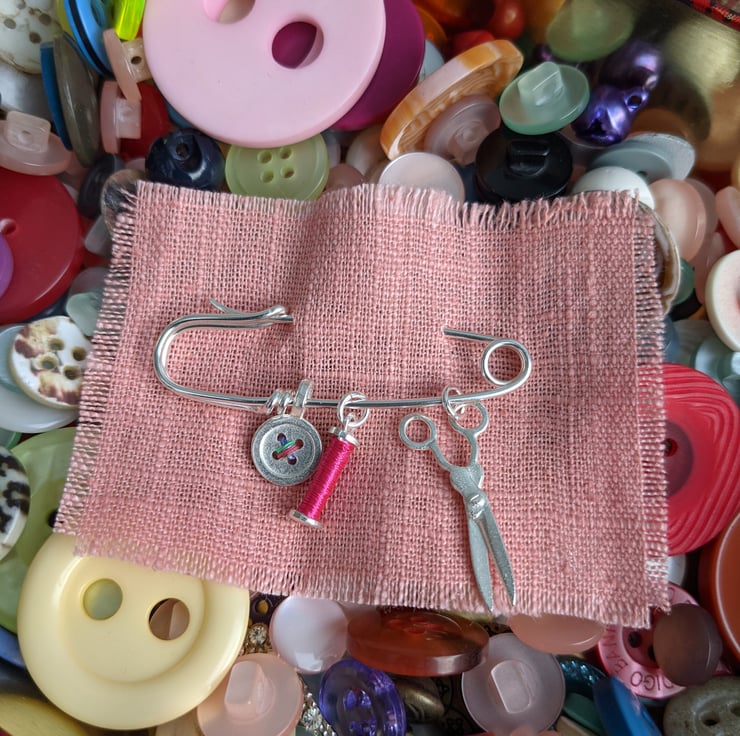 Sewing Charms Brooch, Scissors, Bobbin & Button on a Safety Pin, Sewing Gift