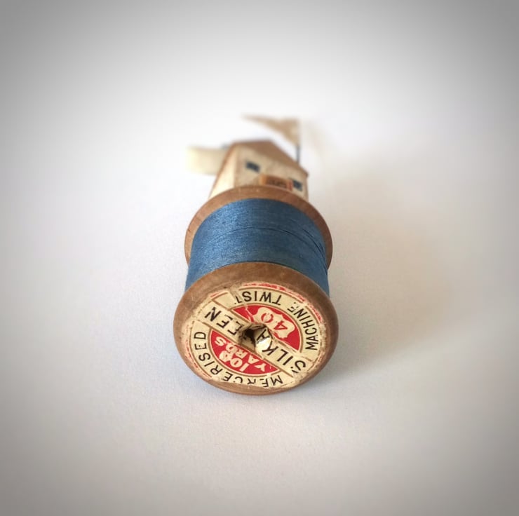 This tiny home and bird friend are perched on top of an old wooden bobbin!