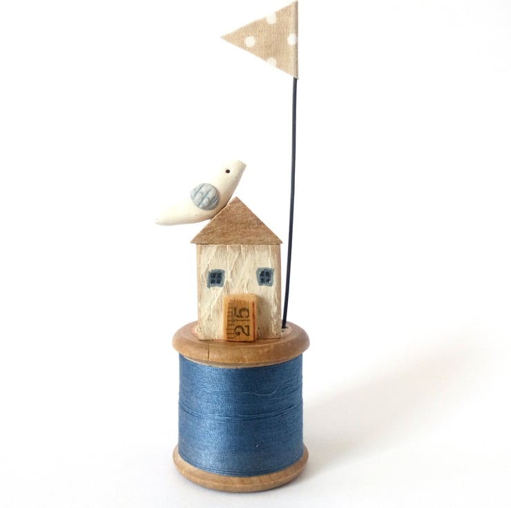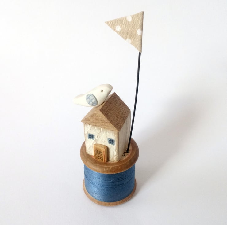 A tiny little oak house sits on a wooden bobbin with a clay sea bird and a spotty sea flag.