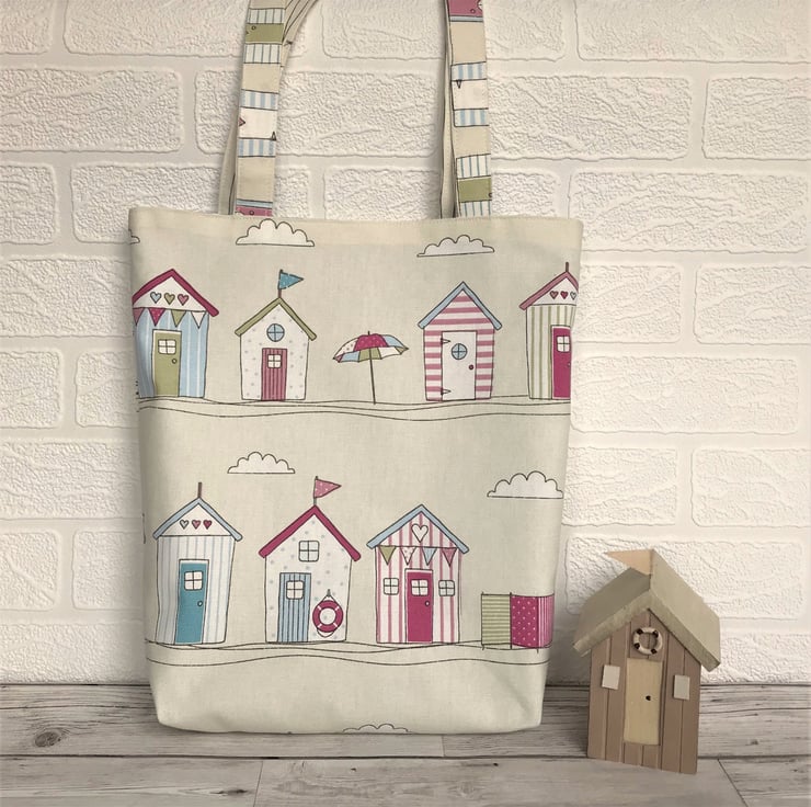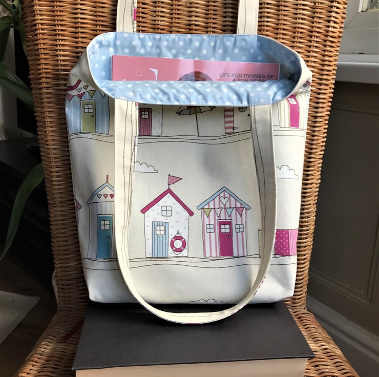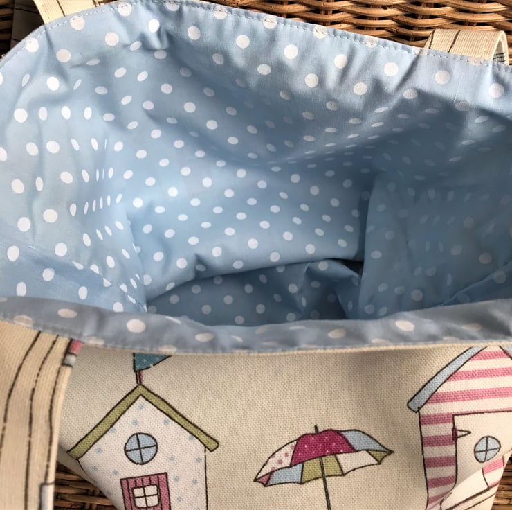 A summery tote bag in cream fabric with a lovely print pattern featuring beach huts. The pattern includes beach huts, bunting, parasols and windbreaks in pastel shades of pink, blue, green and white. The bag is lined with a co-ordinating pale blue fabric with white polka dots.
