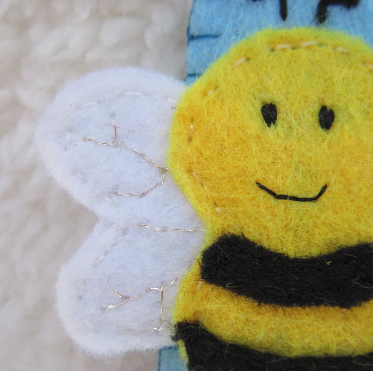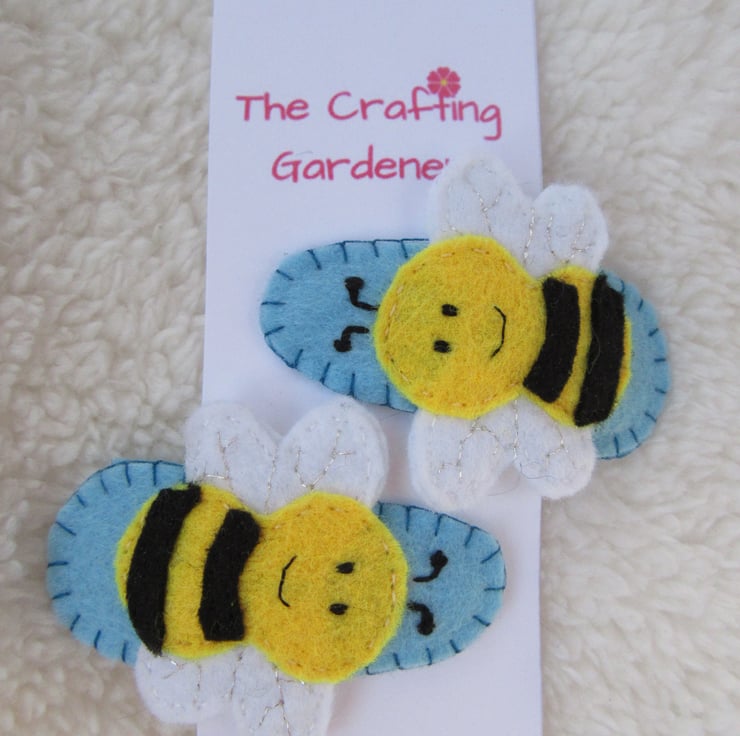 Each bee is hand cut and stitched by me from hardened acyrlic yellow felt, with white wings with silver thread stitching details. The metal snap hair clips are covered with hardened acrylic light blue felt.