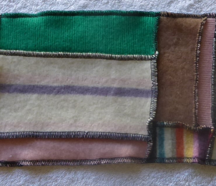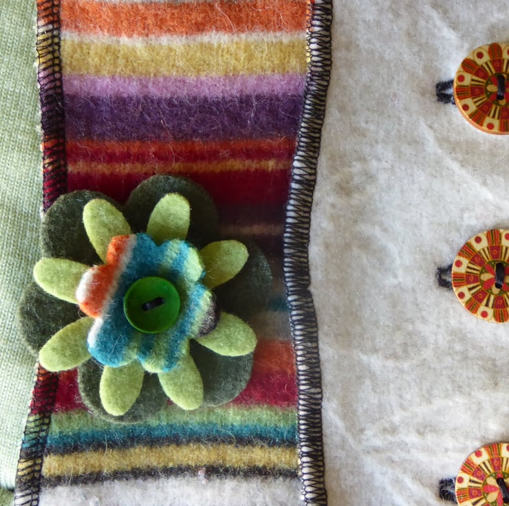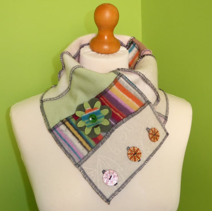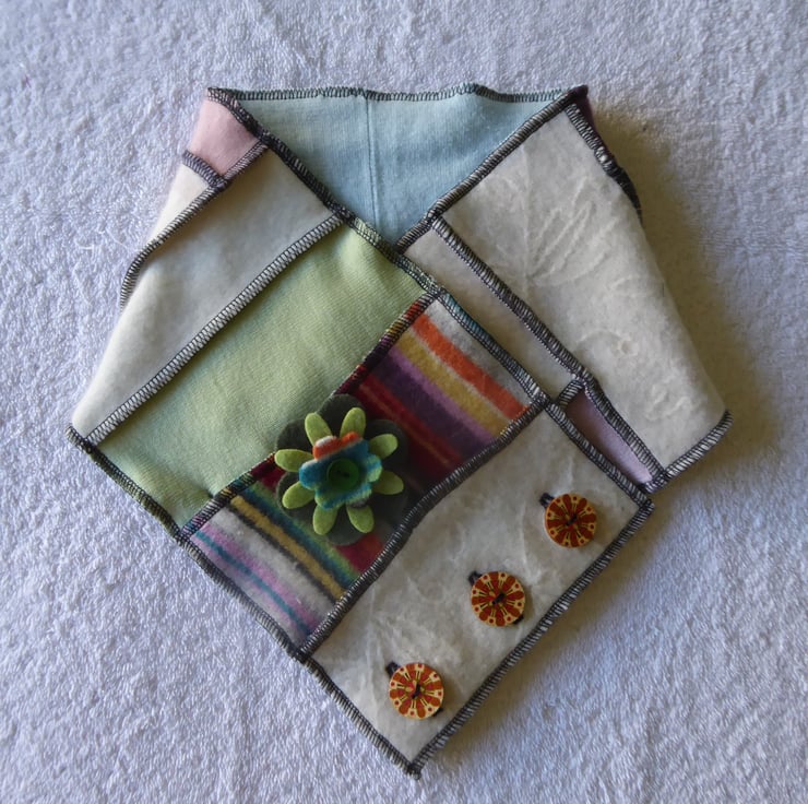 I have designed and created this fantastic cowl to keep you warm and snug. It is made from previously loved and recycled jumpers, that I have washed in a hot temperature and pre-shrunk. I have then cut and re-stitched the jumpers, into a patchwork strip with all seams being professionally finished with a serger/over-locker. Interfacing has been applied behind the buttonholes for stability, before a backing has been stitched in place. 3 wooden buttons have been sewn on to fasten this cowl. A decorative felt flower with button center has been pinned to the cowl with a safety locking clasp, so is removable.