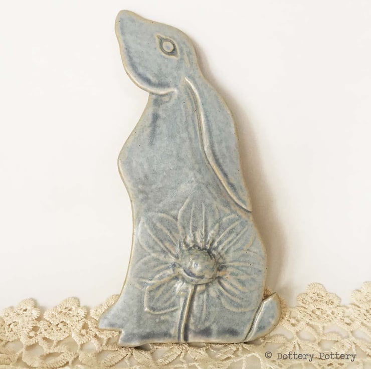 This delightful moon gazing hare is made from textured stoneware clay and decorated with pattern. It is cut from a hand drawn template.