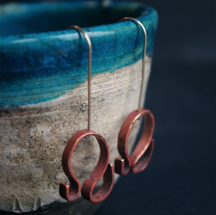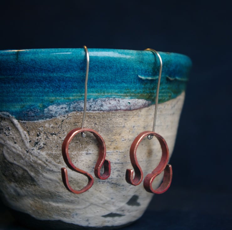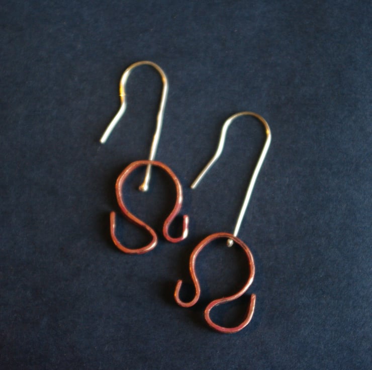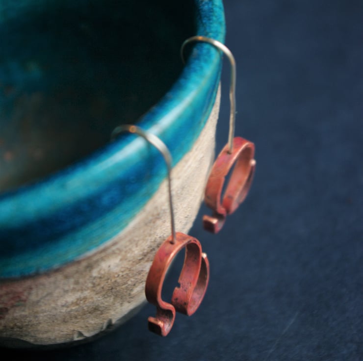 I have made a sterling silver ear hook which has a silver blob on the end ,to stop the copper swirl falling off. It can freely twist about and catch the light as it isn't soldered to the ear hook.