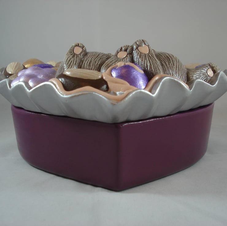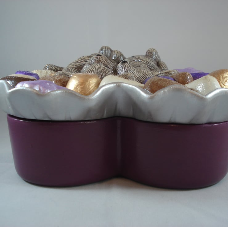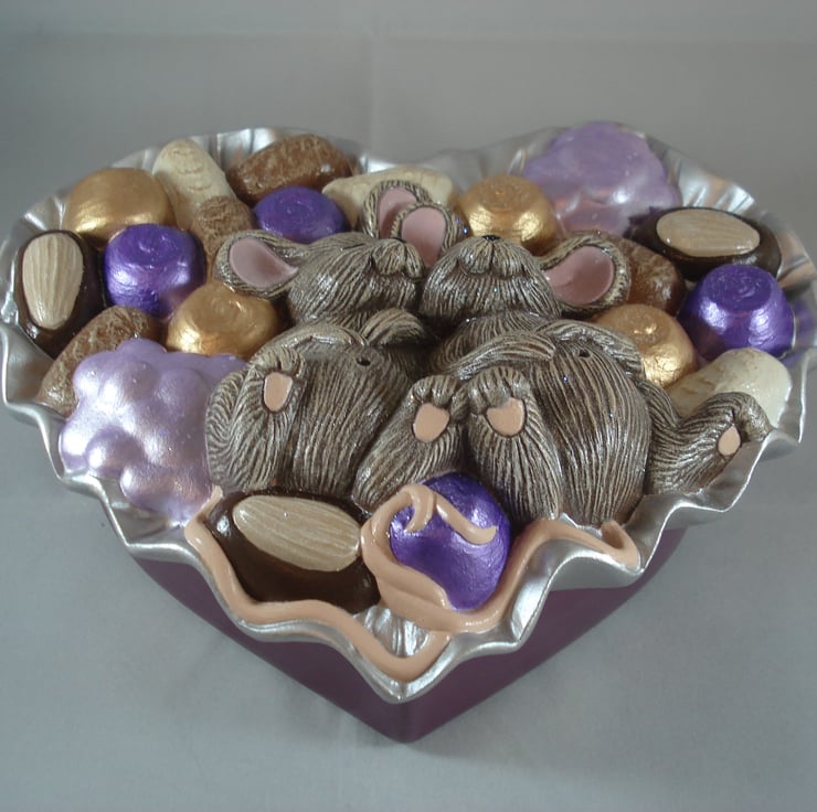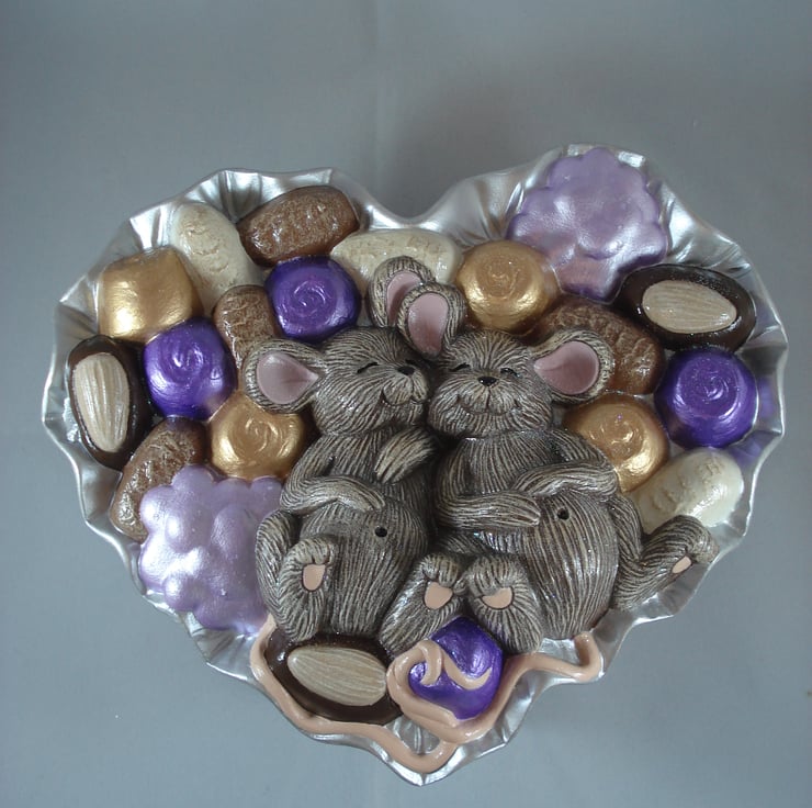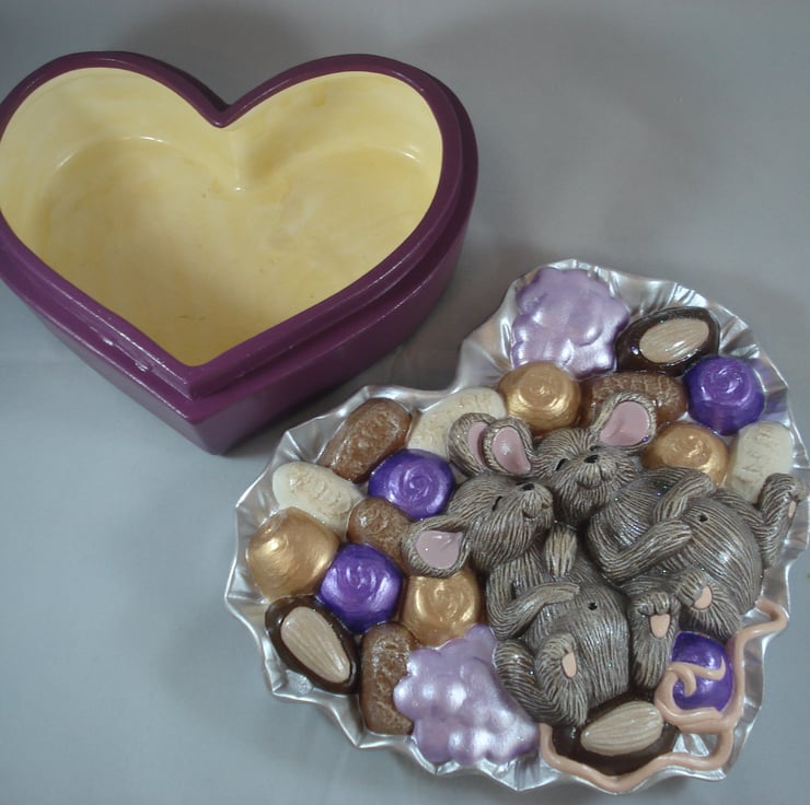 I have for sale a ceramic jewellery/trinket box, which was hand painted by myself. It is a heart shaped box, with the top/lid part made to look like its a box of chocolates, with the added addition of two cute brown mice fast asleep in the middle. This would make a fun and novel addition to anyone's home, or perhaps given as a gift.