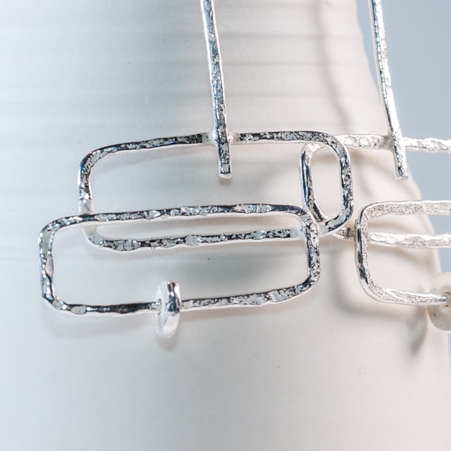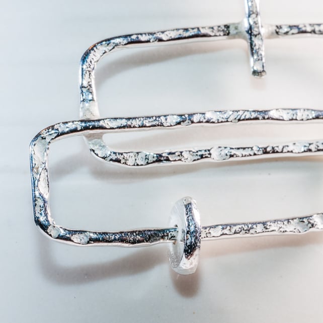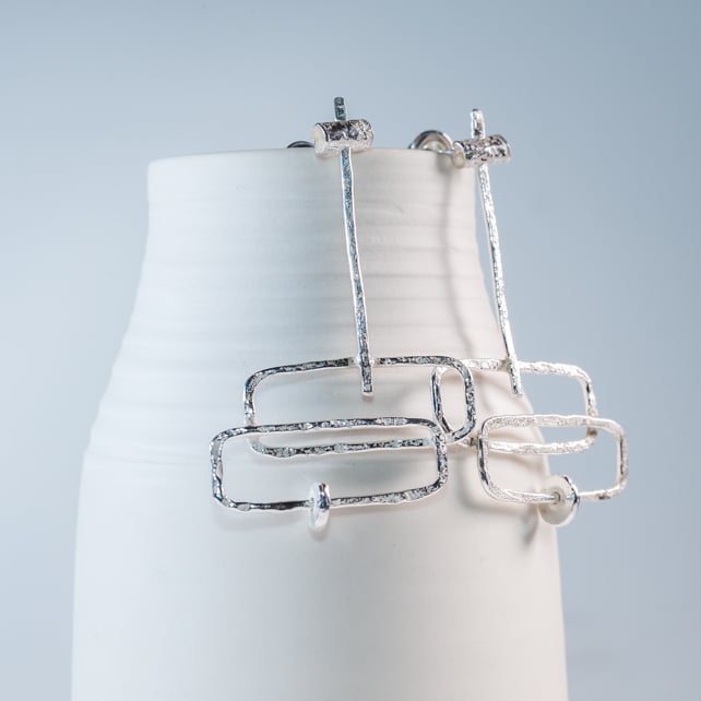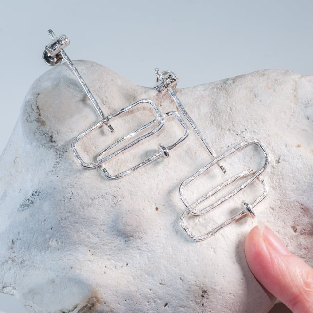 These are lovely statement earrings which are like mini moveable sculptures. So many parts of these move for extra eye catching dazzle. The top bar piece has 360 movement which means the whole earring can change direction as you wear it - from being flat to side on...then the little 'pebble' in the centre moves too. So there's lots of play in these. All made from eco silver hand forged and hammered with lovely secure earring backs - these are gorgeous earrings and work perfectly for everyday or special occasions.
