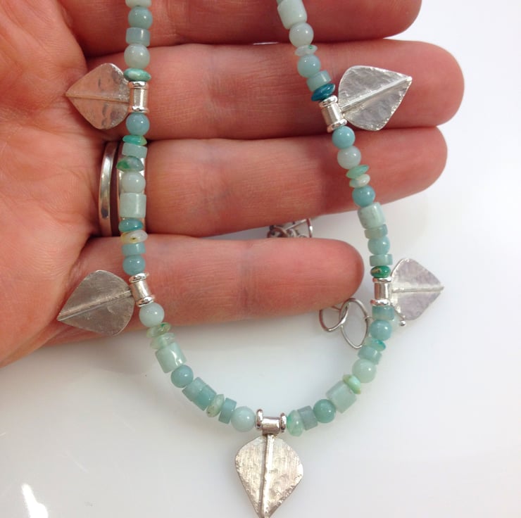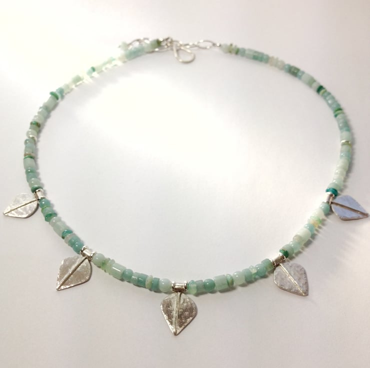 Aqua blue amazonite and Peruvian opal necklace with spear leaf pendants.