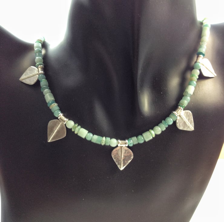 I have made 5 little leaf shaped pendants. These hang from a necklace of aqua beads in a variety of shapes.