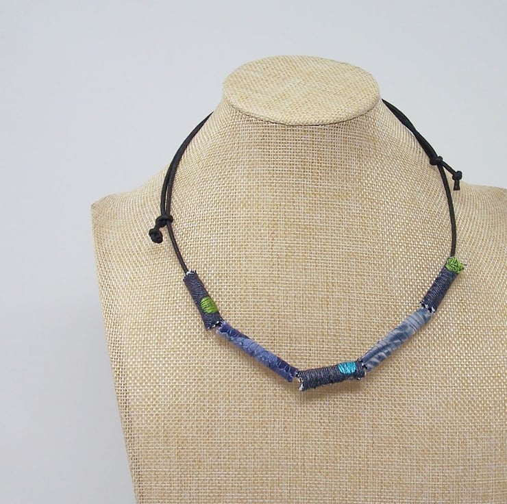 Five handmade fabric beads are threaded onto a black waxed cotton cord. Slip knots allow the wearer to adjust the length to suit, from a tight choker to a looser, drooping necklace.