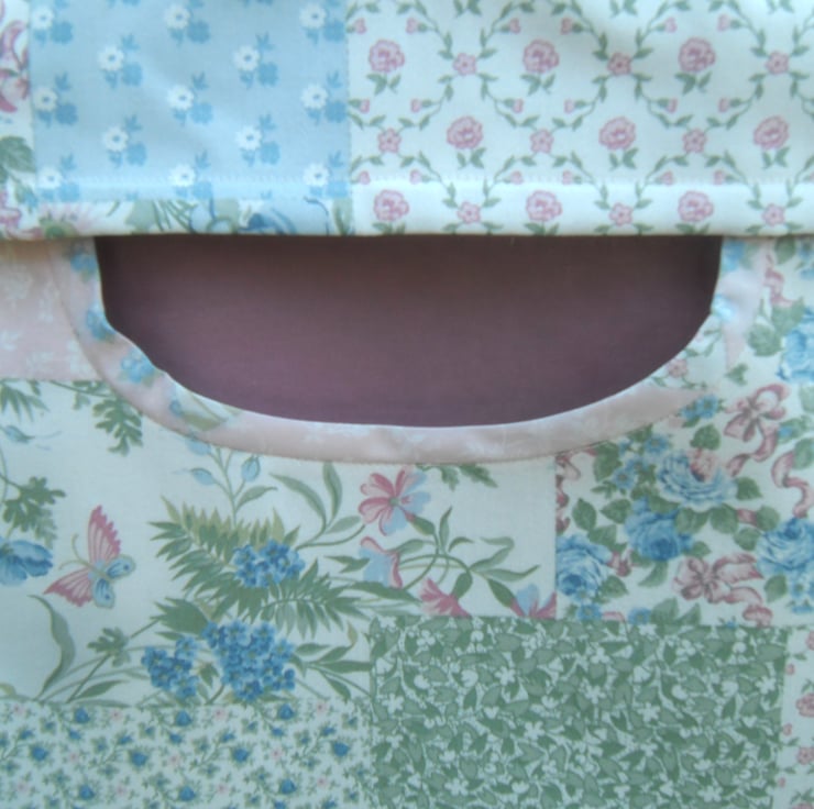 The back is lined with a plain dusky pink cotton fabric and you can see this through the opening. Upper and lower front is lined with white cotton lining fabric.
